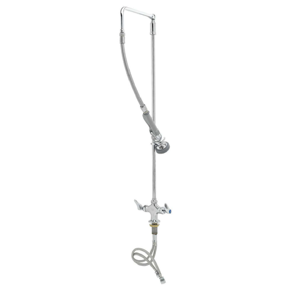 The T&S Brass B-0111 Pre-Rinse Unit is a deck-mount, single-hole mixing faucet designed for efficient commercial kitchen operations. Distinguished by its quarter-turn Eterna cartridges with spring checks, this unit offers durable and reliable performance for high-use environments. The faucet features lever handles with color-coded indexes, ensuring ease of use and quick identification in busy settings. The 32-inch EasyInstall riser and 12-inch L-tube provide flexibility and reach, accommodating various sink sizes and layouts. With a 20-inch flexible stainless steel hose, complemented by a heat-resistant handle and a pull-down ring, it is engineered for user comfort and safety. The unit is equipped with a 1.15 gpm spray valve (B-0107), optimizing water efficiency without compromising performance. The polished chrome-plated brass faucet body adds a sleek, professional aesthetic to any kitchen workspace. Designed with 1/2-inch NPSM male inlets and a 20-inch flexible stainless steel supply hose, installation is straightforward and adaptable. A finger hook provides convenient storage for the spray head when not in use. Meeting the 2019 DOE PRSV Class II standards, the T&S Brass B-0111 is a high-quality choice for food service establishments seeking a reliable and efficient pre-rinse solution.