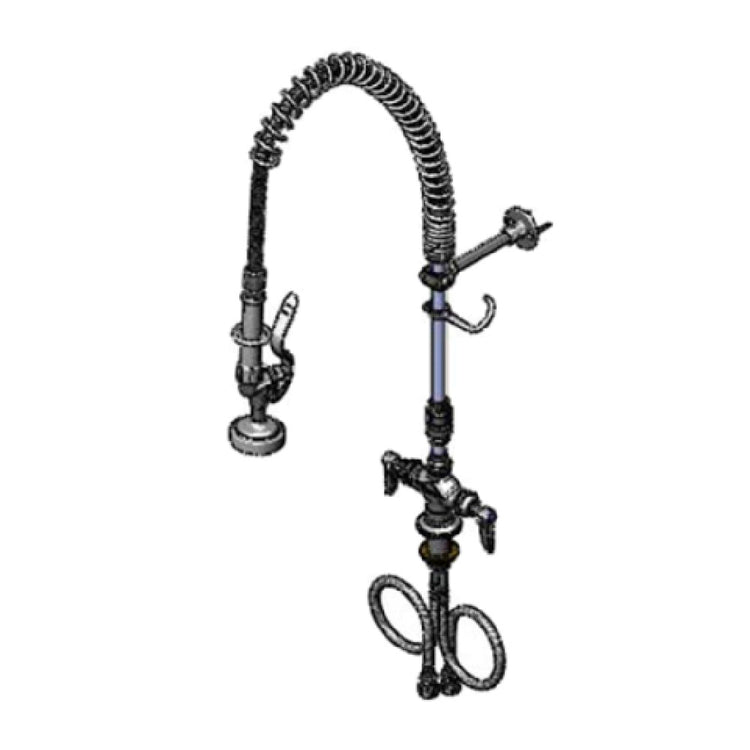 The T-S Brass B-0113-079X-V-B EasyInstall Pre-Rinse Unit is a high-performance kitchen fixture designed for efficiency and durability. This unit features a spring action mechanism that enhances maneuverability and ease of use in various commercial kitchen settings. It is equipped with a single hole base, providing a streamlined installation process. The inclusion of a vacuum breaker ensures backflow prevention, safeguarding water supply integrity. This unit boasts a 1.15 GPM spray valve (B-0107) for effective rinsing and water conservation. The 44-inch flexible stainless steel hose offers excellent reach and flexibility, accommodating diverse rinsing tasks. The 079X 10-inch riser and 6-inch wall bracket provide robust support and stability. Quarter-turn Eterna cartridges facilitate smooth operation and long-lasting performance. Lever handles with color-coded indexes allow for easy identification and operation. Designed to meet low lead requirements, this pre-rinse unit aligns with the 2019 DOE PRSV - Class II standards, ensuring compliance with safety and environmental regulations. The T-S Brass B-0113-079X-V-B offers distinct advantages for restaurant kitchens, catering facilities, and food service establishments seeking reliable and efficient pre-rinse solutions.