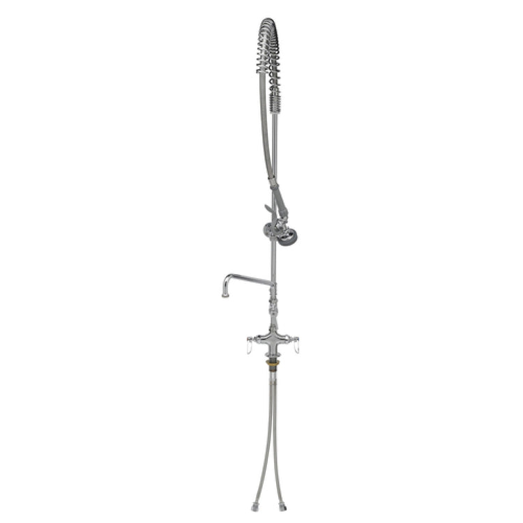 The T&S Brass B-0113-A12B-TEE EasyInstall Pre-Rinse Unit is a high-performance, single-hole base, deck-mounted fixture designed for commercial kitchens requiring efficient pre-rinse solutions. This unit is equipped with a 12-inch swing nozzle, providing flexibility and reach for varying sink sizes and tasks. The 1.15 GPM spray valve assembly (B-0107) ensures water efficiency and powerful cleaning performance. Featuring a 44-inch flexible stainless steel hose, this unit offers durability and ease of maneuverability. The 24-inch riser adds height for additional clearance, while the 6-inch wall bracket supports stability during use. An accessory fitting tee allows for additional connections, enhancing versatility in kitchen setups. The unit incorporates quarter-turn Eterna cartridges, known for their longevity and ease of maintenance, and is compliant with low lead regulations, making it a safe choice for food service applications. This model also meets the 2019 DOE PRSV - Class II standards, ensuring energy efficiency and sustainability. Ideal for restaurants, hotels, and catering services, the T&S Brass B-0113-A12B-TEE combines functionality and compliance, providing a reliable pre-rinse solution tailored to the rigorous demands of professional kitchens.