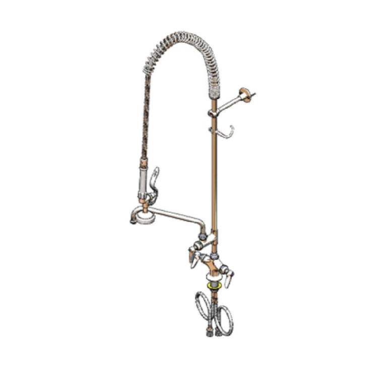 The T&S Brass B-0113-ADF06-B EasyInstall Pre-Rinse Unit - Single Hole Base Deck Mount is designed to enhance efficiency in commercial kitchens. This unit features a 6-inch add-on faucet, coupled with a precise 1.15 GPM spray valve (B-0107), ensuring effective pre-rinse operations with water conservation. It boasts a 44-inch flexible stainless steel hose, offering extensive reach and maneuverability for thorough cleaning tasks. The unit is equipped with 18-inch flexible supply lines facilitating straightforward installation and connectivity. A 6-inch wall bracket provides additional support, ensuring stability during use. The integration of quarter-turn Eterna cartridges enhances durability and ease of use, making this unit ideal for high-demand environments. Its low-lead construction complies with rigorous safety standards, reflecting its commitment to health-conscious practices. The unit adheres to the 2019 DOE PRSV - Class II standards, reinforcing its efficiency and operational reliability. This versatile pre-rinse unit is a valuable asset for restaurants, hotels, and catering services, offering a blend of performance, compliance, and durability that meets the distinct needs of various segments within the food service industry.
