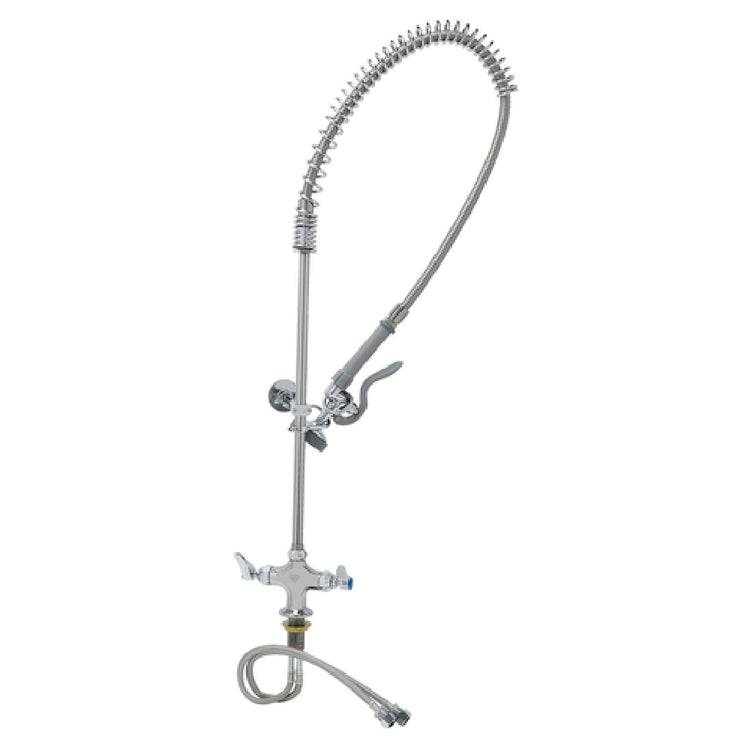 The T&S Brass B-0113-B-20R EasyInstall Pre-Rinse Spring Action Single Hole Base is a high-performance fixture designed to deliver superior efficiency and durability in commercial kitchens. Featuring a 1.15 GPM spray valve (B-0107), this model provides an optimal flow rate for effective pre-rinsing tasks. It is equipped with a 44" flexible stainless steel hose, ensuring a wide reach and flexibility for maneuvering. The unit includes a 20" riser and 18" flexible supply lines, which contribute to its adaptable installation in various kitchen settings. A 6" wall bracket provides additional stability, ensuring the fixture remains securely mounted. Engineered with quarter-turn Eterna cartridges, this product promises long-lasting performance and ease of operation. Importantly, it complies with low lead requirements, aligning with safety and environmental standards. The T&S Brass B-0113-B-20R is recognized under the 2019 DOE PRSV - Class II, indicating its energy-efficient design. This pre-rinse unit caters to the diverse needs of food service establishments, from busy restaurants to small cafes, by combining robust construction with practical features, ultimately enhancing workflow efficiency and hygiene maintenance.
