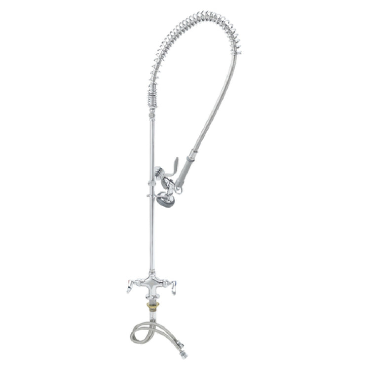 The T&S Brass B-0113-B-TEE EasyInstall Pre-Rinse Unit is a cutting-edge solution tailored for professional kitchens requiring efficiency and reliability. This unit is designed with a single hole base deck mount, providing a streamlined installation process. At its core is the 1.15 GPM spray valve assembly (B-0107), which ensures optimal water flow and conservation, meeting the 2019 DOE PRSV - Class II standards. It features a robust 44-inch flexible stainless steel hose, allowing for extensive reach and maneuverability in busy kitchen environments. The 6-inch wall bracket offers additional support and stability, while the accessory fitting tee facilitates versatile plumbing connections. Featuring quarter-turn Eterna cartridges, this unit promises durability and ease of operation. The low lead construction underscores its compliance with stringent safety standards, making it a preferred choice for establishments prioritizing health and sustainability. The T&S Brass B-0113-B-TEE is ideally suited for restaurants, catering services, and food preparation areas, seeking a high-performance pre-rinse solution that seamlessly integrates into existing setups and enhances operational efficiency.