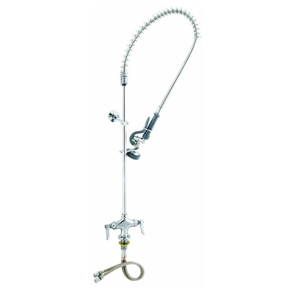 The T&S Brass B-0113-B9 EasyInstall Pre-Rinse Unit Spring Action Single Hole Base is engineered for efficiency and durability in commercial kitchen settings. Featuring a 1.15 GPM spray valve (B-0107), this unit ensures effective water conservation while maintaining powerful cleaning capabilities. The inclusion of a 44-inch flexible stainless steel hose provides exceptional reach and maneuverability, making it suitable for varied cleaning tasks. Its 24-inch riser enhances the unit's functionality, supporting optimal user comfort and efficiency. Equipped with 18-inch flexible supply lines, installation is both straightforward and adaptable to different plumbing configurations. A 6-inch wall bracket offers additional stability and support, ensuring secure mounting. The quarter-turn Eterna cartridges are designed for long-lasting performance, reducing maintenance needs. This pre-rinse unit adheres to low lead standards, aligning with safety and health regulations. Recognized under the 2019 DOE PRSV - Class II, it meets stringent energy and performance criteria. The T&S Brass B-0113-B9 is an ideal choice for food service establishments seeking a reliable, efficient, and compliant pre-rinse solution, combining technical excellence with robust design for a variety of industry applications.