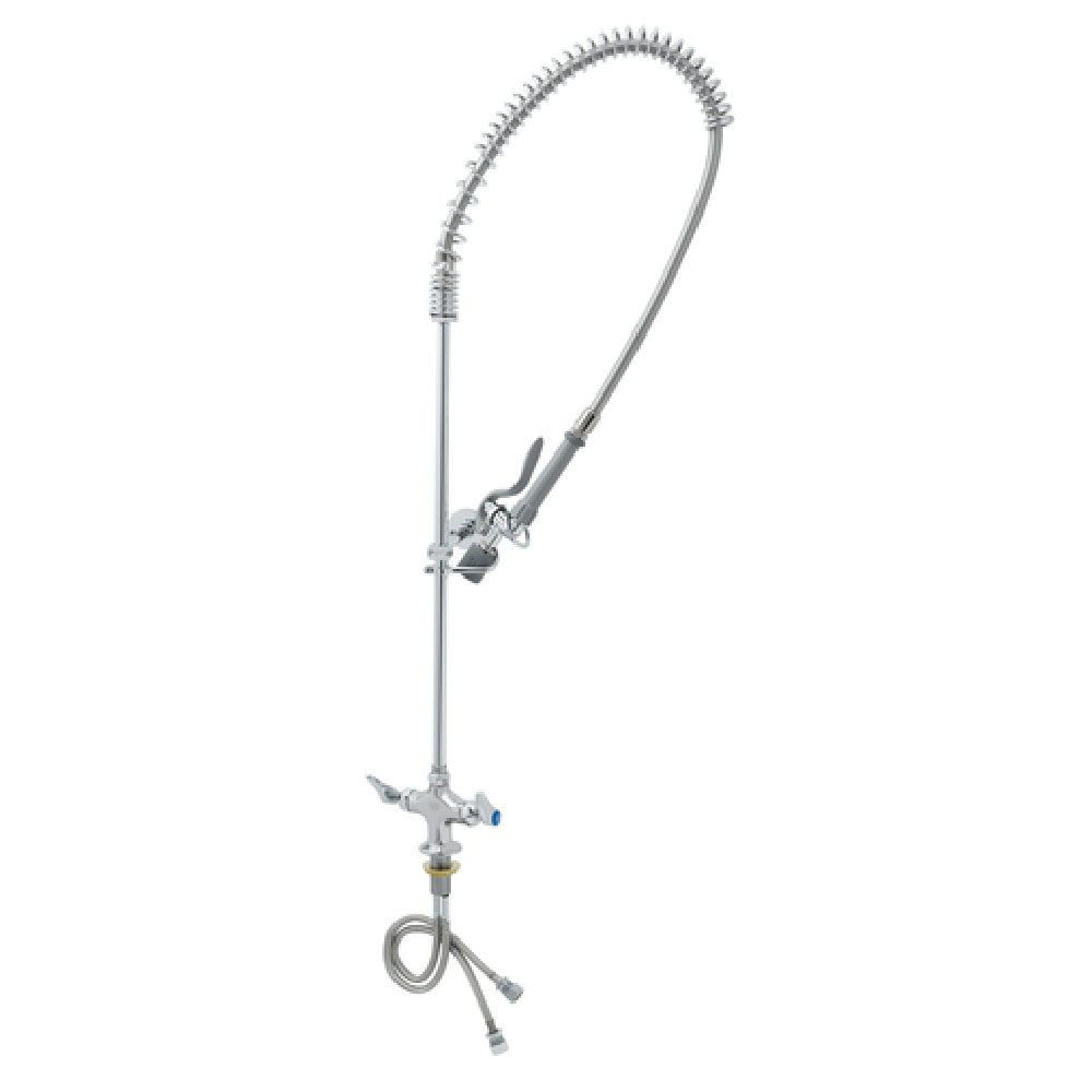 The T&S Brass B-0113-CR-BJ EasyInstall Pre-Rinse Faucet is a versatile fixture designed for efficiency and durability in commercial kitchen environments. This faucet features a deck mount with a single hole base, making it an ideal choice for streamlined setups. It delivers a 1.07 GPM spray through the integrated B-0107-J spray valve, providing consistent and effective rinsing performance. The faucet includes a 44" flexible stainless steel hose and an accompanying 24" riser, offering extensive reach and maneuverability for various kitchen tasks. Additionally, it comes equipped with 18" flexible supply lines and a sturdy 6" wall bracket, ensuring secure installation and reliable operation. The quarter-turn Cerama cartridges enhance the faucet's performance by providing smooth and precise water flow control while adhering to low lead compliance. Recognized under the 2019 DOE PRSV - Class II standards, this faucet is suitable for establishments prioritizing sustainability and efficiency. The T&S Brass B-0113-CR-BJ is engineered to meet the demands of high-volume commercial kitchens, presenting a robust solution that combines functionality with compliance to modern safety and environmental standards.