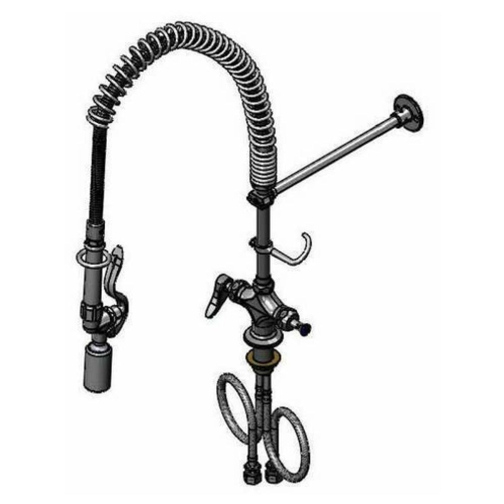 The T&S Brass B-0113-CRBJX36H EasyInstall Pre-Rinse Unit Deck Mount Single Hole Mixing Faucet is an efficient fixture designed for commercial kitchens requiring precise and reliable water flow control. With a 1.07 GPM swivel spray valve (B-0107-J), this faucet offers a consistent and efficient water spray for pre-rinsing operations. The unit features a robust 36-inch flexible stainless steel hose, facilitating easy maneuverability and reach within the sink area. An 8-inch riser provides additional height, enhancing its utility for various sink configurations. The faucet is equipped with 18-inch flexible supply lines, ensuring versatile and straightforward connections to existing plumbing systems. A 12-inch wall bracket adds stability, complementing the deck mount design. The inclusion of quarter-turn Cerama cartridges ensures smooth and reliable operation, minimizing wear and tear over time. Designed with low lead compliance, this faucet meets stringent safety and environmental standards. It adheres to the 2019 DOE PRSV - Class II regulations, highlighting its energy-efficient and environmentally responsible design. This unit is ideal for restaurant kitchens, catering services, and food preparation areas where durability, ease of installation, and efficient performance are essential.