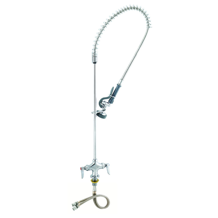 The T&S Brass B-0113-M EasyInstall Pre-Rinse Unit is a high-performance commercial kitchen fixture engineered for efficiency and durability. This unit features a spring action gooseneck design, ensuring flexibility and ease of use during pre-rinse operations. It is equipped with a single hole base faucet, enhancing its straightforward installation process. The unit includes 18-inch flexible stainless steel supply lines fitted with compression fittings compatible with 5/8-inch OD copper tubing, ensuring robust connectivity and water flow. Standing at a height of 45 inches with a 14-inch overhang, this unit provides ample clearance of 19-3/8 inches, which is crucial for accommodating various dish sizes and optimizing workspace utility. The 24-inch riser supports a spray valve (B-0107), delivering superior cleaning performance. Additionally, it comes with a stainless steel hose integrated with a vacuum breaker (B-0044-V9), ensuring backflow prevention and maintaining water purity. Packaged six per master pack, the T&S Brass B-0113-M is an ideal solution for high-demand environments, providing reliability and high functionality for diverse culinary settings. Its design caters to different market segments within the foodservice industry, ensuring that it meets the rigorous standards of professional kitchens.