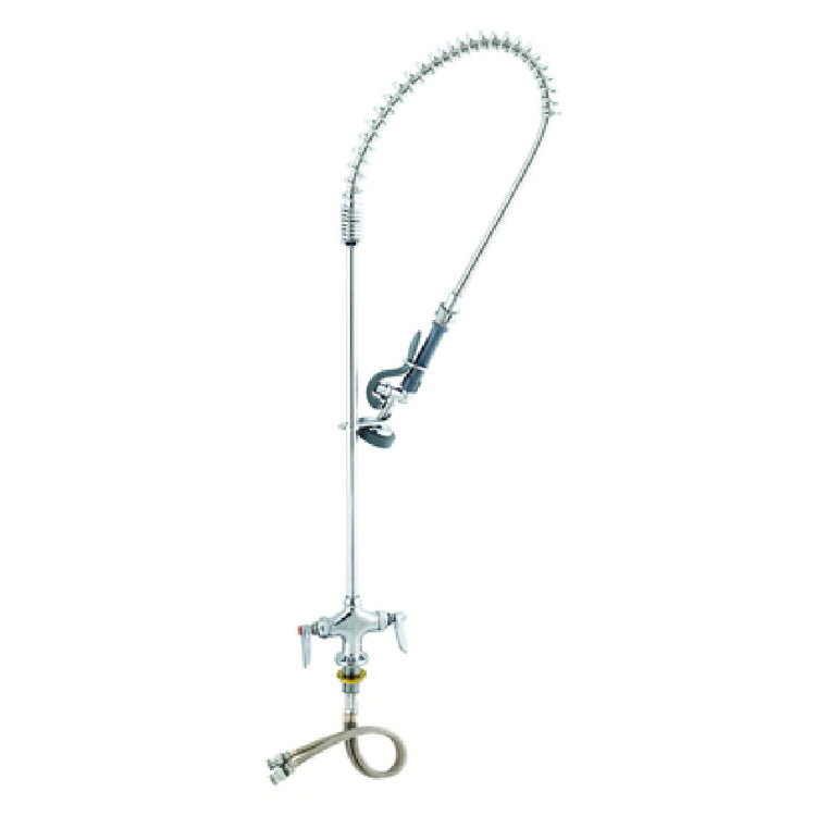 The T-S Brass B-0113-SWV EasyInstall Pre-Rinse Unit Single Hole Deck Mount Mixing Faucet stands out with its innovative design and robust functionality, catering to the needs of commercial kitchens and food service establishments. This unit incorporates a spring action gooseneck and a pre-rinse swivel, optimizing maneuverability and ease of use. Featuring a 1.15 GPM spray valve (B-0107) and a 44-inch flexible stainless steel hose, it provides efficient water usage without compromising performance. The faucet connects via 18-inch flexible supply lines, allowing for a versatile installation process. It is equipped with quarter-turn Eterna cartridges, ensuring reliable and long-lasting operation. The unit adheres to low lead standards, making it compliant with stringent safety regulations. Certified under the 2019 DOE PRSV - Class II, this pre-rinse unit exemplifies efficiency and sustainability. Its single hole deck mount design simplifies installation, making it an ideal choice for busy commercial environments where time and space are paramount. The T-S Brass B-0113-SWV is engineered to provide high performance and durability, making it a valuable asset across different segments of the food service industry, from fast-paced kitchens to high-end dining establishments.