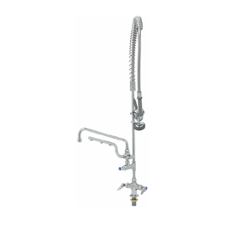 The T&S Brass B-0113-U12-B UltraRinse Single Hole Deck Mount Mixing Faucet with Polished Chrome Plated Brass Body is a meticulously engineered fixture designed for versatile applications in various industry sectors. This faucet integrates an add-on faucet with a compression cartridge and spring check, coupled with a convenient lever handle, ensuring precise water flow control. Featuring a 12-inch swing nozzle equipped with a stream regulator outlet, it delivers efficient water distribution. The faucet is further enhanced with a 10-1/2 inch multiple tip 1.5 GPM swivel spray arm, complemented by a 24-inch riser and a 44-inch flexible stainless steel hose with a heat-resistant handle for robust and reliable operation. The 1.15 GPM spray valve ensures water efficiency, while the 18-inch flexible stainless steel supply hoses with 1/2-inch NPSM / 5/8-inch compression connections provide seamless installation. Designed for stability, the unit includes a 6-inch adjustable wall bracket and a spray valve holder supported by an overhead spring. The faucet meets ASME A112.18.1/CSA B125.1, NSF 61-Section 9, and NSF 372 certifications, and is 2019 DOE PRSV - Class II compliant, highlighting its adherence to high-performance and safety standards, making it an ideal choice for demanding commercial environments.