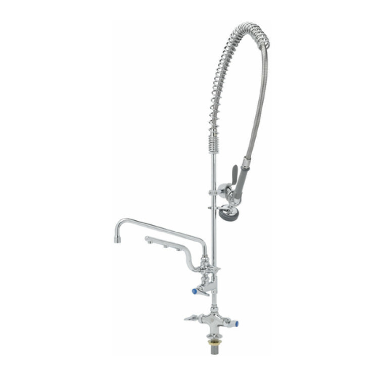 The T&S Brass B-0113-U12-CR-B UltraRinse Single Hole Deck Mount Mixing Faucet with Polished Chrome Plated Brass Body is a sophisticated solution tailored for diverse market segments within the plumbing industry. This faucet features a robust, polished chrome-plated brass body, ensuring durability and a sleek aesthetic. It includes an add-on faucet with a ceramic cartridge and check valve, coupled with a lever handle for precise control. The 12-inch swing nozzle, equipped with a stream regulator outlet, enhances versatility, while the 10 1/2" 1.5 GPM multiple tip sprayer arm provides efficient rinsing capabilities. A 24-inch rigid riser and a 44-inch flexible stainless steel hose with a heat-resistant handle and a 1.15 GPM spray valve offer further flexibility and reach. The inclusion of ceramic cartridges with check valves and lever handles enhances reliability and ease of use. For additional support, a 6-inch adjustable wall bracket, spray valve holder, and overhead spring are provided. This product is certified to ASME A112.18.1/CSA B125.1, NSF 61-Section 9, and NSF 372 standards, and is compliant with the 2019 DOE PRSV - Class II requirements, ensuring its suitability for high-demand environments that prioritize efficiency, compliance, and performance.