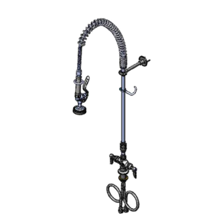 The T&S Brass B-0113-V-B EasyInstall Pre-Rinse Unit stands out in the industry with its practical design and reliable features. This unit is characterized by its spring action mechanism and a single-hole base, ensuring ease of installation and stability. Designed for efficiency, it includes a vacuum breaker and a spray valve rated at 1.15 GPM (B-0107), making it a suitable choice for conserving water without compromising performance. The 44-inch flexible stainless steel hose offers extensive reach and durability, while the 18-inch flexible supply lines provide versatile connectivity options. The inclusion of a 6-inch wall bracket adds support and convenience, enhancing the unit’s stability during use. Notable for its quarter-turn Eterna cartridges, this pre-rinse unit guarantees smooth operation and longevity. The product is also low lead compliant, aligning with health standards. Certified under the 2019 DOE PRSV - Class II, it meets stringent efficiency requirements. This pre-rinse unit is an excellent choice for various segments within the foodservice industry, from high-volume kitchens to smaller establishments, offering a blend of functionality, compliance, and ease of use that caters to diverse operational needs.