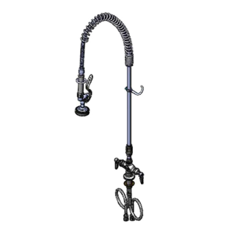 The T&S Brass B-0113-V EasyInstall Pre-Rinse Unit Spring Action Single Hole Base is an exceptional fixture designed to meet the rigorous demands of commercial kitchens. This unit features a durable spring action mechanism and a single hole base, ensuring stability and ease of installation. It is equipped with a vacuum breaker and a 1.15 GPM spray valve (B-0107), making it efficient in water conservation. The 44-inch flexible stainless steel hose allows for extensive reach and flexibility, essential for various kitchen tasks. Moreover, the unit includes 18-inch flexible supply lines and quarter-turn Eterna cartridges, ensuring long-lasting performance and reliability. The low lead composition aligns with health and safety standards, while its compliance with the 2019 DOE PRSV - Class II regulations underscores its efficiency and environmental responsibility. This pre-rinse unit is ideal for a range of sectors within the food service industry, including restaurants, hotels, and catering services, delivering a blend of functionality and compliance. Its design and specifications cater to businesses aiming to streamline kitchen operations while adhering to regulatory standards.