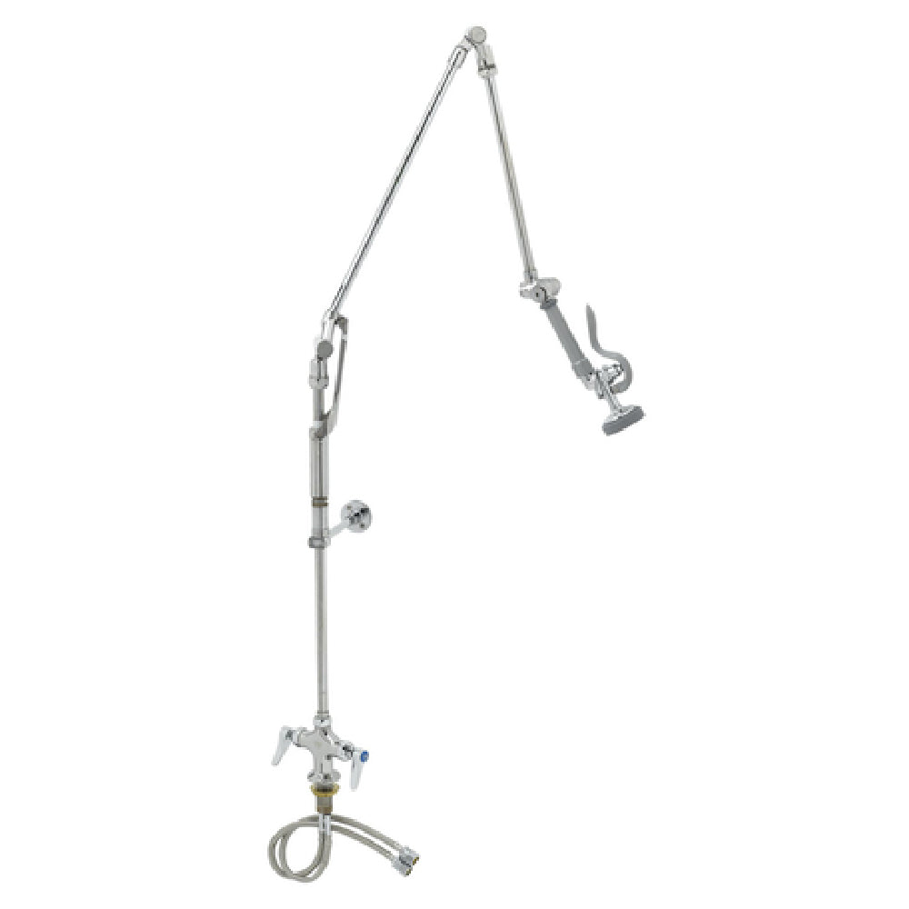 The T&S Brass B-0114-01B Pre-Rinse Unit Deck Mount Single Hole Mixing Faucet is an innovative solution designed for efficiency and versatility in commercial kitchens. This unit features a 1.15 GPM spray valve (B-0107) that is engineered for water conservation without compromising on performance. Its retractable arm assembly allows for a maximum pull down position of 29-1/4", providing flexibility and ease of use in various kitchen settings. The included 44" flexible stainless steel hose and 18" flexible supply lines ensure robust water delivery and adaptability to different sink configurations. A 6" wall bracket offers secure installation, while the quarter-turn Eterna cartridges enhance durability and ease of operation. This pre-rinse unit is compliant with low lead requirements and meets the 2019 DOE PRSV - Class II standards, reflecting its commitment to environmental responsibility and regulatory compliance. With its innovative design and reliable performance, the T&S Brass B-0114-01B is an ideal choice for food service establishments looking to improve efficiency and maintain high standards of hygiene in their operations.