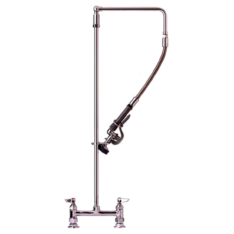 The T&S Brass B-0121 Pre-Rinse Unit is a meticulously engineered fixture ideal for commercial kitchens requiring efficient cleaning solutions. This unit features an 8-inch center deck faucet and a high-performance 1.15 GPM spray valve (B-0107), ensuring optimal water flow for pre-rinsing tasks. Equipped with a 20-inch flexible stainless steel hose, it offers extensive reach and maneuverability, making it suitable for a variety of sink configurations. The union coupling connectors facilitate secure and easy installation, while the 1/2-inch female eccentric flanged inlets ensure compatibility with standard plumbing setups. The gooseneck extends 12 inches over the sink, providing ample clearance, and the 32-inch riser enhances its functional range. The unit incorporates quarter-turn Eterna cartridges, known for their durability and reduced maintenance needs. It adheres to low lead standards, aligning with modern safety requirements, and complies with the 2019 DOE PRSV - Class II regulations, confirming its efficiency and environmental friendliness. The T&S Brass B-0121 Pre-Rinse Unit stands out as a versatile solution for food service establishments, offering a balance of design and functionality tailored to meet the rigorous demands of professional kitchens. Its robust construction and thoughtful design make it a valuable addition to any culinary workspace.
