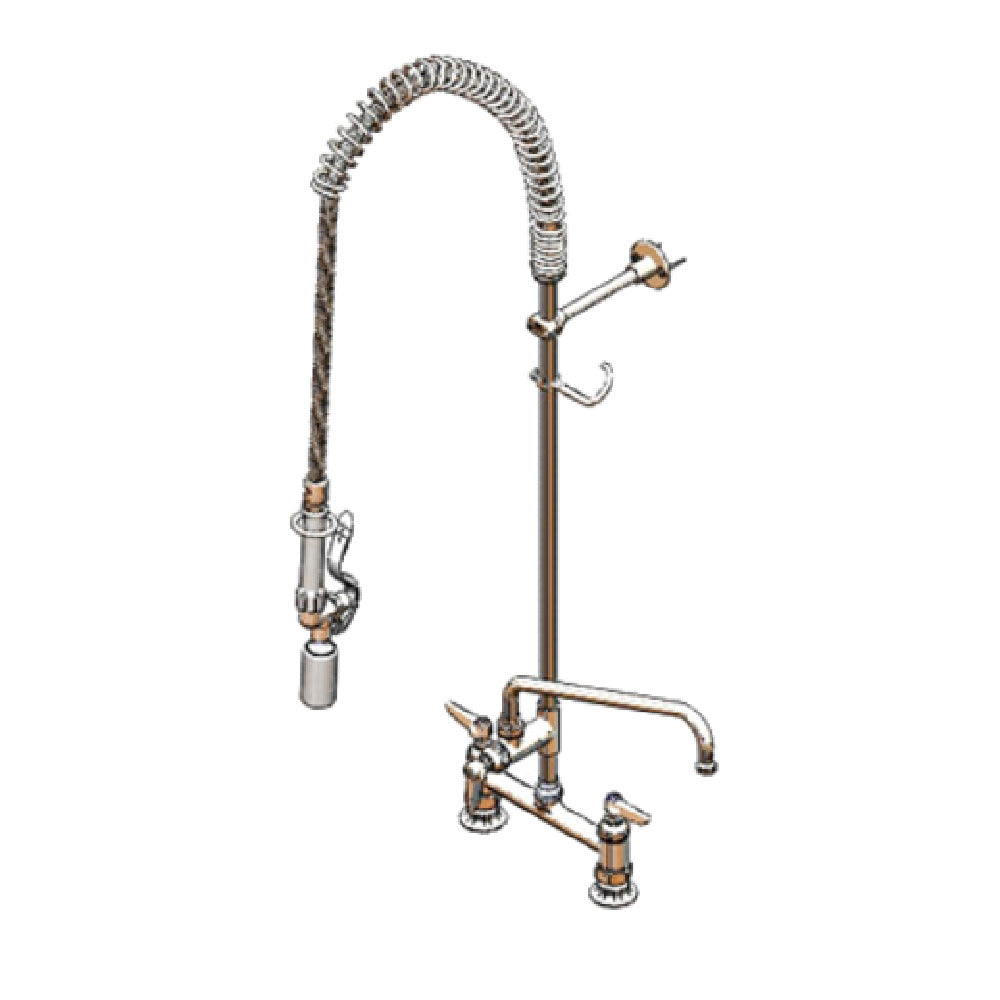 The T&S Brass B-0123-12-CR-BC EasyInstall Pre-Rinse Unit Deck Mount Base 8" Adjustable Center is a highly efficient solution designed for commercial kitchen environments, offering a range of features that cater to various operational needs. This unit includes a deck mount base with an 8-inch adjustable center, allowing for flexible installation in diverse settings. Its spring action gooseneck design ensures durability and ease of use, coupled with a low flow 0.65 GPM spray valve (B-0107-C) for water efficiency. The unit also features a 12-inch swing spout add-on faucet, providing additional versatility for tasks requiring extended reach. A 24-inch riser and a 44-inch flexible stainless steel hose enhance its adaptability and functionality. The setup is further supported by 2-inch diameter deck flanges with 1/2-inch NPT female flanged inlets and a 6-inch wall bracket for secure mounting. Lever handles and quarter-turn Cerama cartridges offer seamless operation, while the low lead construction aligns with safety standards. The unit is compliant with the 2019 DOE PRSV - Class II regulations, ensuring its compatibility with contemporary energy and resource conservation requirements. This pre-rinse unit is an essential component for efficient, sustainable kitchen operations across various industries.