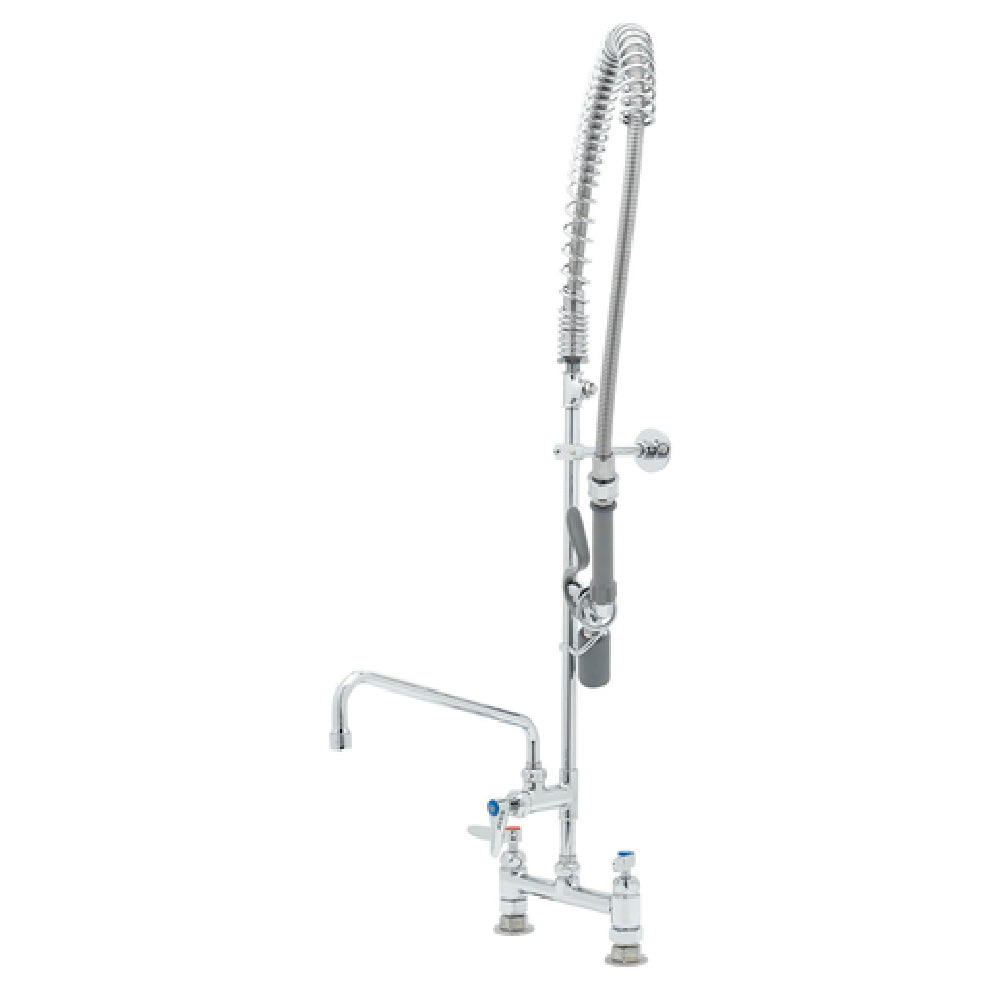 The T&S Brass B-0123-12CRBJST EasyInstall Pre-Rinse Unit - Deck Mount Base 8" Adjustable Center is a meticulously engineered solution tailored for diverse sectors within the foodservice industry. This unit is equipped with a spring action gooseneck for ease of use and features a highly efficient 1.07 GPM spray valve (B-0107-J), making it an ideal choice for kitchens prioritizing water conservation and efficiency. Complementing its primary function, the unit includes a 12" swing spout add-on faucet and an 18" riser, enhancing its versatility for various tasks. The 44" flexible stainless steel hose ensures robust durability and maneuverability, while the accessory fitting tee provides additional connectivity options. Designed for seamless integration, it boasts 2" Ã152; deck flanges with 1/2" NPT female flanged inlets, and a 6" wall bracket for secure installation. Its lever handles and quarter-turn Cerama cartridges offer smooth operation, and the low lead composition adheres to strict safety standards. Notably, this unit complies with the 2019 DOE PRSV - Class II requirements, reinforcing its commitment to environmental responsibility. The T&S Brass B-0123-12CRBJST is a prime choice for establishments seeking a reliable, adaptable, and eco-friendly pre-rinse solution.