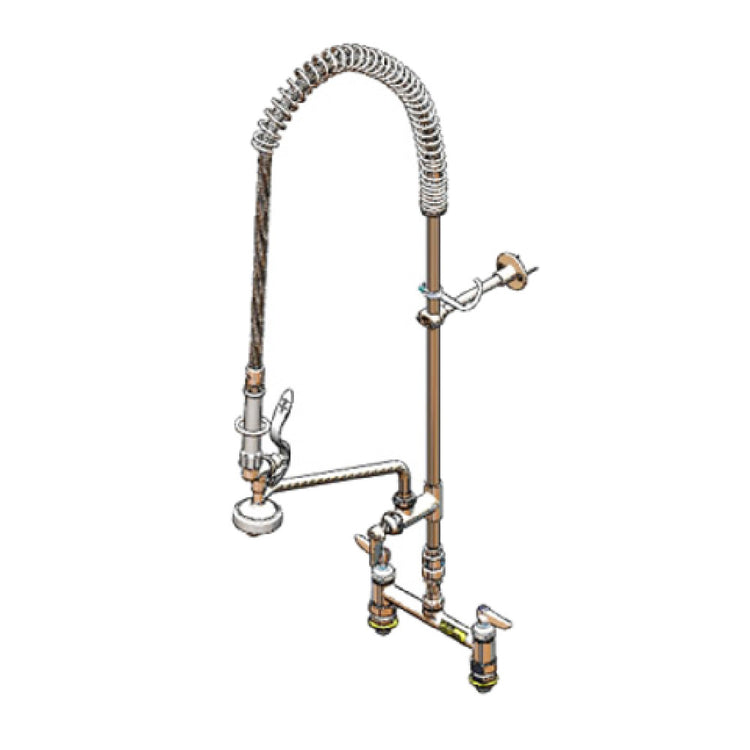 The T&S Brass B-0123-12CRCCVB EasyInstall Pre-Rinse Unit Deck Mount Base 8" Adjustable Center is a meticulously engineered solution for commercial kitchens requiring versatile and efficient pre-rinse capabilities. Featuring a deck mount base, the unit boasts an 8" adjustable center, allowing for seamless customization to fit various sink configurations. The spring action gooseneck coupled with a vacuum breaker ensures reliable backflow prevention and optimal water flow management. Equipped with a 1.15 GPM spray valve (B-0107), this unit is tailored for efficient cleaning tasks. The 12" swing spout add-on faucet and 24" riser enhance its adaptability, while the 44" flexible stainless steel hose provides extensive reach and maneuverability. The installation is further supported by 2" Ø deck flanges with 1/2" NPT female flanged inlets and a 6" wall bracket for added stability. Lever handles and quarter-turn Cerama cartridges contribute to a user-friendly experience, ensuring durability and precision control. Certified as low lead and compliant with the 2019 DOE PRSV - Class II, this unit aligns with modern regulatory standards. The T&S Brass B-0123-12CRCCVB is an essential asset for food service operations, combining advanced functionality with compliance and efficiency.