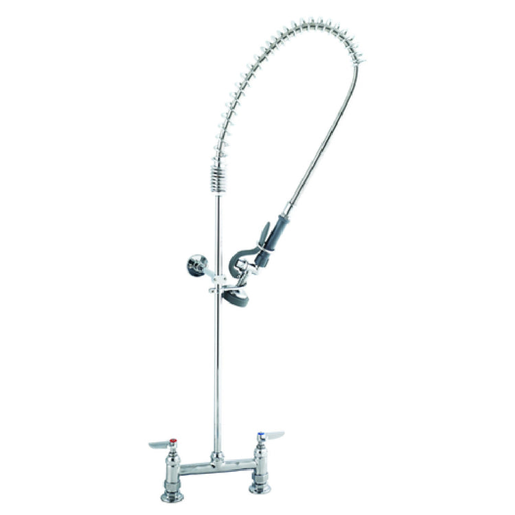 The T&S Brass B-0123-B9 EasyInstall Pre-Rinse Unit is a versatile and efficient solution for commercial kitchens, engineered with precision to meet the diverse needs of the industry. This deck mount base unit features an 8-inch adjustable center, allowing for adaptable installation in various settings. Its spring action gooseneck enhances user convenience, paired with a 1.15 GPM spray valve (B-0107) designed for effective water usage. The unit includes a 24-inch riser and a 44-inch flexible stainless steel hose, providing extensive reach and durability for rigorous kitchen environments. Supporting structural integrity, a 9-inch wall bracket is also included. The 2-inch diameter deck flanges with 1/2-inch NPT female flanged inlets ensure secure and stable fixture attachment. Operability is simplified with lever handles and quarter-turn Eterna cartridges, known for their robustness and ease of operation. This unit is compliant with low lead standards and the 2019 DOE PRSV - Class II, marking it as a responsible choice for food service applications. The T&S Brass B-0123-B9 is a reliable choice for establishments seeking performance and adaptability, ensuring high standards of efficiency and compliance in busy kitchen settings.