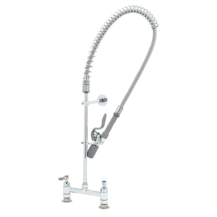 The T&S Brass B-0123-CR-BJ EasyInstall Pre-Rinse Unit Deck Mount Base 8" Center is a meticulously engineered solution for the commercial kitchen environment. Featuring a deck mount base designed with an 8" center, this unit is ideal for efficient pre-rinse operations. It boasts a spring-action gooseneck and a 1.07 GPM spray valve (B-0107-J), ensuring optimal water flow and cleaning power. The unit is equipped with a 24" riser and a 44" flexible stainless steel hose, providing ample reach and flexibility for various cleaning tasks. A 6" wall bracket offers additional support, maintaining stability during use. The 2" deck flanges with 1/2" NPT female flanged inlets ensure secure installation, while the lever handles allow for easy operation. With quarter-turn Eterna cartridges, this unit promises durability and smooth performance. Notably, the product adheres to low lead standards and complies with the 2019 DOE PRSV - Class I regulations, highlighting its commitment to safety and efficiency. This pre-rinse unit is a valuable asset for restaurants, cafeterias, and institutional kitchens, where reliability and performance are paramount, and where equipment needs to meet rigorous standards for both functionality and compliance.