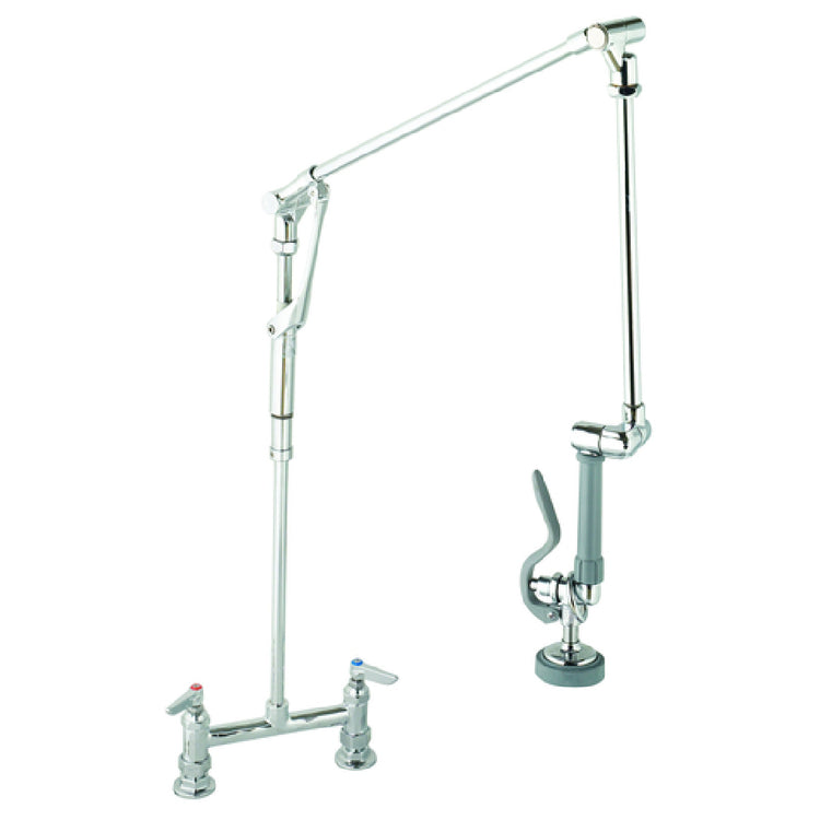 The T&S Brass B-0124 Pre-Rinse Unit is a meticulously engineered component designed for professional kitchen environments, offering a seamless blend of functionality and durability. This unit features an 8-inch center deck faucet with union coupling connections, ensuring a secure and versatile installation for various plumbing configurations. Equipped with 1/2-inch IPS female eccentric flanged inlets, it provides robust water flow management, vital for high-demand kitchen operations. The innovative roto-flex swivel design enhances maneuverability and ease of use, allowing for precise control and flexibility during pre-rinse operations. Central to its functionality is the renowned B-0107 spray valve, known for its efficiency in water utilization while delivering powerful rinsing capabilities. This pre-rinse unit is designed to meet the rigorous demands of commercial kitchens, catering to diverse markets within the food service industry, including restaurants, cafeterias, and catering businesses. Its durable construction and advanced design make the T&S Brass B-0124 a valuable asset for establishments prioritizing efficiency and reliability in their kitchen operations. Whether in a bustling restaurant or a large-scale food service enterprise, this pre-rinse unit serves as a crucial tool in maintaining high standards of cleanliness and productivity.