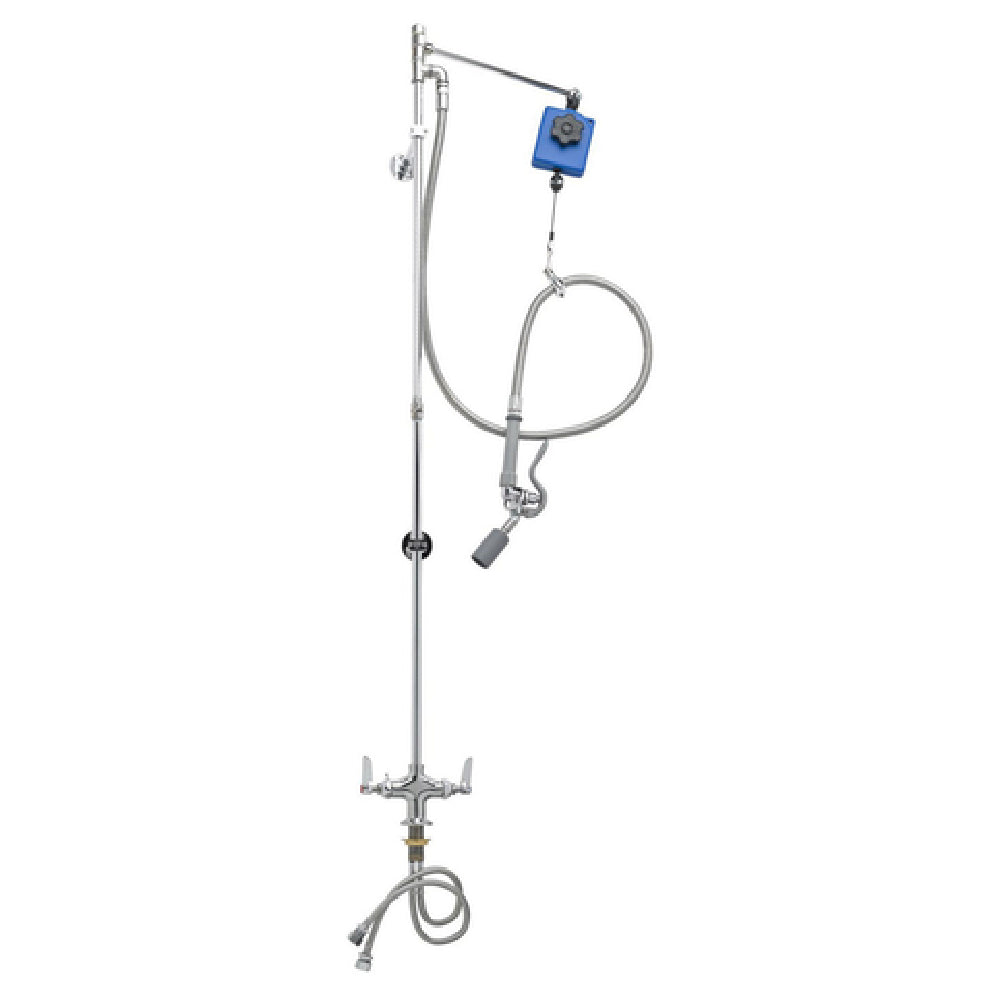 The T&S Brass B-0126-VB Pre-Rinse Unit Deck Mount Single Hole Mixing Faucet is engineered for performance and durability, making it an essential addition to any commercial kitchen setting. This unit features quarter-turn Eterna cartridges with integrated spring checks, ensuring reliable operation and longevity. It is equipped with lever handles that are color-coded for ease of use. The design includes two 24-inch risers and an overhead swivel extension arm with adjustable tension, facilitating versatility in kitchen workflows. A swivel elbow assembly with a 3/8-inch NPT vacuum breaker enhances safety and efficiency. The unit also includes a 68-inch flexible stainless steel hose with a heat-resistant gray handle and hold down ring, complemented by a 0.65 gpm low flow spray valve (B-0107-C35) for water conservation. Its 18-inch flexible stainless steel supply hoses and a 6-inch adjustable wall bracket provide added flexibility during installation. Constructed from polished chrome-plated brass, the faucet body ensures robust quality and aesthetic appeal. The T&S Brass B-0126-VB is complete with 1/2-inch NPSM male inlets and is cCSAus certified, catering to the stringent standards of diverse industry markets. This product exemplifies the blend of technical precision and practical utility, offering a comprehensive solution to meet the demands of high-traffic commercial environments.