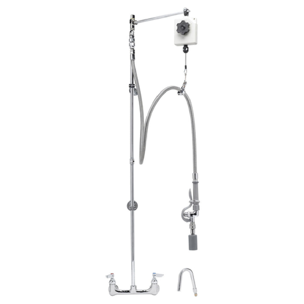 The T&S Brass B-0130 Pre-Rinse Balancer is a wall-mounted unit with an 8-inch center-to-center (c/c) configuration, tailored for efficient and precise pre-rinse applications in commercial settings. This model includes a quick disconnect low flow valve and a hook nozzle, designed to optimize water usage while maintaining performance standards. It is equipped with a wall bracket for secure installation and includes a VB Hose, which is known for its durability and flexibility in demanding kitchen environments. The use of Eterna cartridges ensures longevity and reliability, minimizing the need for frequent maintenance. Additionally, this product adheres to low lead requirements, making it a safer choice for environments conscious of health and safety standards. Its specialized design makes it a practical solution for restaurants, hotels, and other food service establishments that prioritize water efficiency and equipment durability. The T&S Brass B-0130 Pre-Rinse Balancer stands out for its combination of robust construction and thoughtful engineering, addressing the specific needs of diverse market segments within the hospitality and food service industries.
