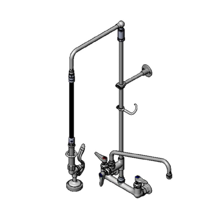 The T&S Brass B-0131-ADF14-B EasyInstall Pre-Rinse Unit Wall Mount Mixing Faucet with 8" Adjustable Centers is an advanced plumbing solution designed for optimal performance in commercial kitchens. It features an EasyInstall add-on faucet that includes a 14" swivel gooseneck with a stream regulator outlet (063X), ensuring precise water flow control. This unit is equipped with quarter-turn Eterna cartridges, complete with spring checks, which enhance durability and ease of use. Lever handles with color-coded indexes provide user-friendly temperature adjustments. The 26" riser is complemented by an overhead swivel arm and a 20" flexible stainless steel hose, featuring a heat-resistant gray handle and hold-down ring for added safety and functionality. The unit's 1.15 GPM spray valve (B-0107) ensures efficient water usage, while the 6" adjustable wall bracket provides flexible installation options. Constructed from polished chrome-plated brass, this faucet boasts a robust body and 1/2" NPT female inlets, ensuring reliable performance. Certified by CSA, the T&S Brass B-0131-ADF14-B is a versatile choice for food service establishments, combining functionality with technical precision to meet the diverse needs of industry professionals seeking a durable and efficient pre-rinse unit.