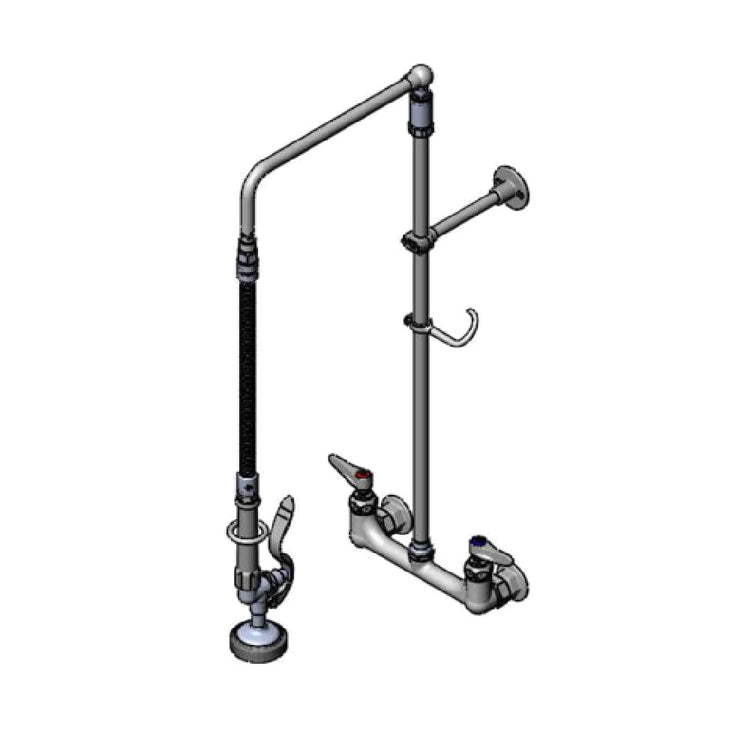 The T&S Brass B-0131-B EasyInstall Pre-Rinse Unit Wall Mount Mixing Faucet With 8" Adjustable Centers is a meticulously engineered piece designed to meet the demanding needs of various industry segments. With its 8-inch adjustable centers, this faucet offers flexibility and precision in installation, accommodating diverse spatial requirements. The unit features robust quarter-turn Eterna cartridges with spring checks, ensuring longevity and reliability in high-use environments. Lever handles with color-coded indexes provide intuitive operation and enhance usability. It includes a 26-inch EasyInstall riser with an overhead swivel arm, allowing for effortless maneuverability. The 20-inch flexible stainless steel hose is equipped with a heat-resistant gray handle and hold-down ring, offering durability and comfort during use. The 1.15 GPM spray valve (B-0107) delivers efficient water flow management, coupled with a convenient finger hook for secure storage. To ensure stability during operation, a 6-inch adjustable wall bracket is included. Constructed from polished chrome-plated brass, the faucet body combines aesthetics with strength, while the 1/2-inch NPT female inlets ensure compatibility with standard plumbing fittings. Certified by CSA, this unit is a versatile and reliable choice for restaurants, hospitality venues, and commercial kitchens requiring robust performance and durability in pre-rinse operations.