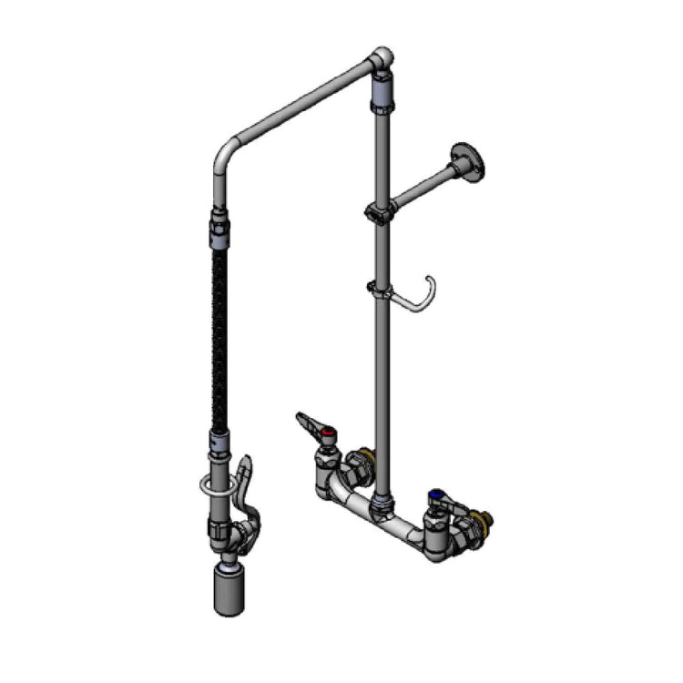 The T&S Brass B-0131-BC-425 EasyInstall Pre-Rinse Unit Wall Mount Mixing Faucet with 8" Adjustable Centers is engineered for efficiency and adaptability in demanding kitchen environments. This unit integrates quarter-turn Eterna cartridges with spring checks, ensuring smooth operation and preventing backflow for enhanced reliability. The faucet features lever handles with color-coded indexes for easy identification and operation. A 26" EasyInstall riser with an overhead swivel arm provides flexibility, while the 20" flexible stainless steel hose is equipped with a heat-resistant gray handle and a hold-down ring for durability and comfort. The included 0.65 GPM low flow spray valve (B-0107-C) aids in water conservation without sacrificing performance. A finger hook and a 6" adjustable wall bracket enhance practicality and stability. Crafted with a polished chrome-plated brass faucet body, this unit ensures both longevity and aesthetic appeal. The package includes two 1/2" NPT inlet supply nipple kits and 1/2" NPT female inlets, making it a comprehensive solution for professional kitchens. This product meets CSA standards, confirming its safety and compliance for use in various foodservice applications. The T&S Brass B-0131-BC-425 is a versatile choice for those seeking high-quality and efficient pre-rinse units in the foodservice industry.