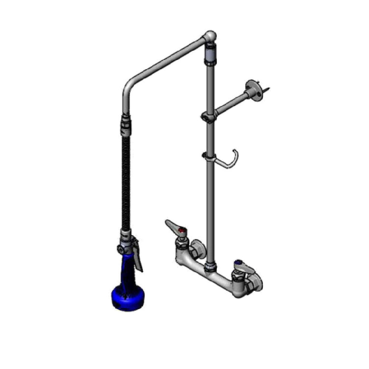 The T&S Brass B-0131-CR-B08C EasyInstall Pre-Rinse Unit Wall Mount Mixing Faucet With 8" Adjustable Centers is an advanced fixture tailored for commercial kitchen applications. This faucet features 8-inch adjustable centers, providing flexibility for various installation requirements. It incorporates quarter-turn Cerama cartridges with check valves, ensuring durability and optimal water flow control. The unit is equipped with lever handles, which are color-coded for easy identification and operation. The 26-inch EasyInstall riser, paired with an overhead swivel arm, enhances reach and maneuverability, making it a practical choice for high-demand kitchen environments. The 20-inch flexible stainless steel hose is complemented by a heat-resistant gray handle and hold down arm, offering resilience under continuous use. A 0.65 GPM low flow spray valve (B-0108-C) contributes to water conservation, aligning with eco-friendly operational practices. The inclusion of a finger hook and a 6-inch adjustable wall bracket ensures secure placement and convenient accessibility. Constructed with a polished chrome-plated brass body, the faucet combines aesthetic appeal with robust performance. The 1/2-inch NPT female inlets provide standard connectivity, and the unit is CSA certified, affirming its compliance with safety standards. This pre-rinse unit exemplifies efficiency and reliability, catering to the needs of diverse industry segments.