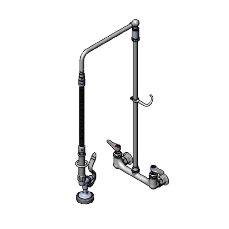 The T&S Brass B-0131 EasyInstall Pre-Rinse Unit Wall Mount Mixing Faucet with 8" Adjustable Centers is an indispensable fixture for commercial kitchens seeking efficiency and reliability. It features robust quarter-turn Eterna cartridges equipped with spring checks, ensuring smooth operation and preventing backflow. The lever handles are thoughtfully designed with color-coded indexes for ease of use, enhancing user experience in high-paced environments. The unit includes a 26" EasyInstall riser complete with an overhead swivel arm, providing flexibility and reach, essential for effective pre-rinsing tasks. Additionally, the 20" flexible stainless steel hose is accompanied by a heat-resistant gray handle and a hold-down ring, offering durability and safety during usage. This faucet is fitted with a 1.15 GPM spray valve (B-0107), optimizing water flow for efficient cleaning performance. Its polished chrome-plated brass body not only adds aesthetic appeal but also ensures long-term durability. With 1/2" NPT female inlets, it allows for straightforward installation, making it adaptable to various plumbing configurations. Certified by CSA, this T&S Brass unit underscores its commitment to quality and safety standards, making it a valuable addition to restaurants, cafes, and any food service establishments requiring a high-performance pre-rinse solution.