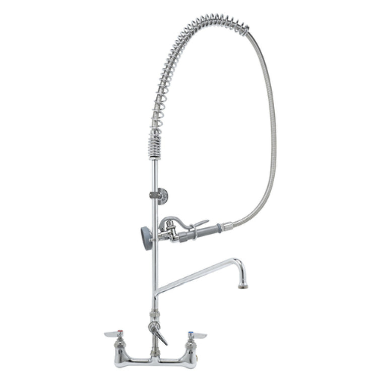 The T&S Brass B-0133-01 EasyInstall Pre-Rinse Unit Mixing Faucet 8" Wall Mount is engineered to meet the rigorous demands of commercial kitchens and food service establishments. This versatile unit features an 8-inch wall mount and a 14-inch add-on 063X swing nozzle, making it highly adaptable for various sink configurations. The 18-inch riser and overhead spring enhance the unit's functionality, providing flexibility and reach that are crucial in fast-paced environments. Equipped with lever handles, the B-0133-01 ensures easy and precise water control. The unit boasts a 56-inch flex hose, allowing for extensive maneuverability. Eterna cartridges are incorporated into the design, known for their durability and long-lasting performance. Additionally, the unit includes a spray valve (B-0107) and a 9-inch wall support (B-0109-02), ensuring stability and ease of use. The 1/2-inch male NPT connection ensures compatibility with standard plumbing systems. Importantly, this product is EPAct2005 compliant, aligning with environmental and efficiency standards. The T&S Brass B-0133-01 is ideal for a range of applications within the hospitality and service industries, offering unparalleled reliability and functionality for professionals seeking a high-performance pre-rinse unit.
