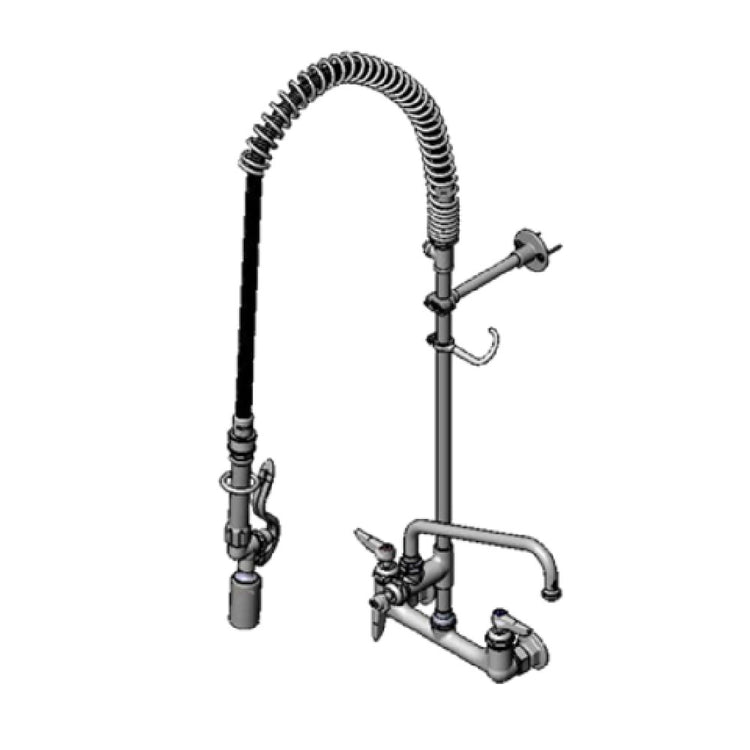 The T&S Brass B-0133-10CRBJST Pre-Rinse Unit - a premier EasyInstall wall mount mixing faucet - is meticulously designed for efficiency and versatility with its 8-inch adjustable centers. This unit is equipped with quarter-turn Cerama cartridges featuring check valves, ensuring a secure and smooth operation. The lever handles come with color-coded indexes, enhancing usability and reducing operational errors. For additional functionality, it includes an add-on faucet with a 10-inch swing nozzle, providing extended reach and flexibility in various applications. The unit's 44-inch flexible stainless steel hose is complemented by a 1.07 gallons per minute spray valve with swivel, delivering a powerful and precise cleaning performance. A 6-inch wall bracket ensures stable installation, while the finger hook and accessory fitting tee add convenience for customized setups. This robust package is further supported by a 1/2-inch NPT male elbow installation kit, making it a comprehensive solution for professional kitchens, food service establishments, and industrial settings seeking reliable and adaptable plumbing fixtures. The T&S Brass B-0133-10CRBJST Pre-Rinse Unit is an embodiment of quality engineering, catering to diverse demands with its superior design and functional excellence.