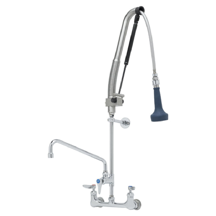The T&S Brass B-0133-12-CRB8P EasyInstall DuraPull Pre-Rinse Unit is engineered for efficiency and versatility, perfect for commercial kitchens requiring high-performance fixtures. This unit features an 8-inch adjustable wall mount complemented by an add-on faucet, ensuring adaptability to various installation needs. It includes a 12-inch swing nozzle equipped with a Series 1 stream regulator outlet, which optimizes water flow. The quarter-turn Cerama cartridges with integrated check valves provide precise control and prevent backflow, enhancing operational reliability. The lever handles with color-coded indexes facilitate intuitive operation and temperature management. Additional components include a 12-inch riser and a 6-inch wall bracket, which offer structural stability and easy mounting. The centerpiece is a stainless steel pull-down activated valve unit, featuring a 1.07 GPM insulated grip handle blue sprayer that ensures comfortable and efficient use. A 30-inch flexible stainless steel hose offers ample reach for pre-rinse tasks, while the 1/2-inch NPT female inlets ensure compatibility with existing plumbing systems. Certified by cCSAus for compliance and constructed with low lead materials, this pre-rinse unit is a durable and safe choice for the modern food service industry, catering to the needs of both small and large-scale operations.
