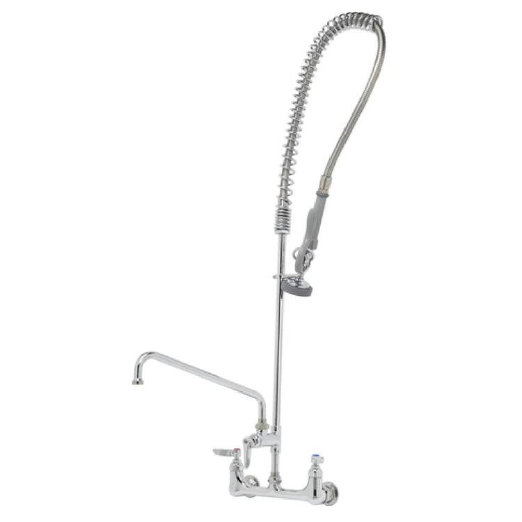 The T&S Brass B-0133-ADF10 EasyInstall Pre-Rinse Unit Wall Mount Base 8" Centers is an exceptional fixture designed for efficient and versatile use in commercial kitchens. This pre-rinse unit features a wall mount base engineered with 8-inch centers, providing a robust and stable installation foundation. It is equipped with a 44-inch flexible hose complemented by an overhead spring body, ensuring ease of movement and extended reach for thorough rinsing tasks. At the heart of its operation is the B-0107 spray valve, renowned for its durability and effective water delivery. The unit also includes an 18-inch riser that supports an add-on faucet, complete with a 10-inch swing nozzle, which adds to its functional versatility. The lever handles facilitate easy operation, while the 1/2-inch NPT female inlets ensure secure water connections. Engineered with quarter-turn Eterna cartridges, this pre-rinse unit guarantees long-lasting performance. Additionally, it is constructed with low lead materials, making it compliant with safety standards. This meticulously crafted unit is ideal for various market segments within the food service industry, offering reliability and efficiency for establishments that demand consistent and high-quality kitchen operations.