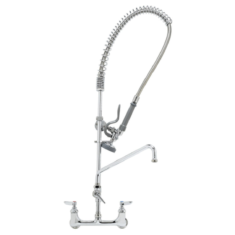 The T-S Brass B-0133-ADF12-B EasyInstall Pre-Rinse Unit with Mixing Faucet is a high-performance fixture tailored for commercial kitchen environments. It features robust components ideal for heavy-duty use, including a wall mount base with 8-inch centers and a 6-inch wall bracket for secure installation. This unit is equipped with a B-0044-H stainless steel flexible hose lined with a polyurethane inner hose, ensuring durability and flexibility for demanding tasks. The overhead spring body coupled with the B-0107 spray valve provides superior rinsing capabilities. An 18-inch riser and an add-on faucet with a 12-inch swing nozzle (062X) enhance its versatility, catering to multifaceted kitchen operations. Eterna cartridges with spring checks and lever handles ensure smooth and reliable operation, while 1/2-inch NPT female inlets facilitate seamless connectivity. This comprehensive pre-rinse unit is engineered to streamline kitchen workflows, offering an efficient solution for establishments ranging from bustling restaurants to institutional cafeterias. Its easy installation and high-quality construction make it a valuable asset in maintaining hygiene standards and operational efficiency in various food service sectors.