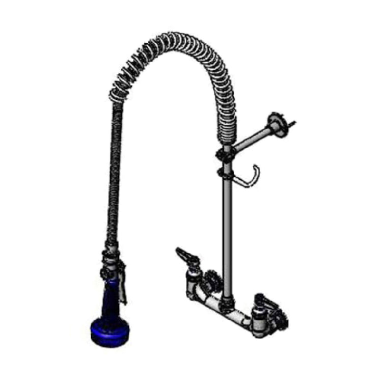 The T-S Brass B-0133-B08-SWV EasyInstall Pre-Rinse Unit Spring Action Gooseneck 8" Wall Mount Mixing Faucet is a versatile and robust solution designed for demanding commercial kitchen environments. This unit features an intuitive spring action gooseneck, providing flexibility and ease of use for diverse washing tasks. It comes equipped with a 44" flexible stainless steel hose, ensuring durability and extended reach, complemented by a 6" wall bracket for secure installation. The faucet's 8" wall mount design integrates seamlessly into existing setups, offering a space-efficient solution suitable for high-traffic areas. Engineered with Eterna cartridges with spring checks, this unit is built for longevity, reducing maintenance needs and potential downtimes. With a 1/2" NPT female inlet, it ensures compatibility with standard plumbing systems. The B-0133-B08-SWV is EPAct 2005 compliant, highlighting its commitment to water efficiency and conservation, making it an excellent choice for environmentally conscious operations. Whether for busy restaurants, catering services, or institutional kitchens, this pre-rinse unit combines practicality with performance, accommodating a variety of needs with its blend of reliable design and efficient functionality.