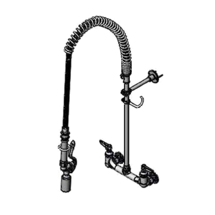 The T&S Brass B-0133-BJ-SWV-T EasyInstall Pre-Rinse Unit 8" Wall Mount Swivel Spray Valve is a top-tier solution designed for demanding commercial kitchens. This pre-rinse unit comes with an 8-inch wall mount and a swivel spray valve that facilitates efficient cleaning, making it an essential component for various markets within the food service industry. It features a robust 44-inch stainless steel flex hose that ensures flexibility and durability, while the inclusion of a 6-inch wall bracket provides additional stability. The unit is equipped with a 1/4 compression cartridge for reliable operation and a lever handle for easy control. A stream regulator tip manages water flow with precision, complimented by its 1.07 GPM spray valve, which is both effective and water-efficient. Constructed to meet low lead standards, it includes a tee fitting and a 1/2" NPT connection, ensuring compatibility and ease of installation. The T&S Brass B-0133-BJ-SWV-T is EPAct2005 compliant, meeting stringent environmental and operational standards. With its technical precision and high-quality components, this pre-rinse unit is engineered to deliver exceptional performance and reliability in fast-paced kitchen environments. This product stands as an asset for businesses seeking efficiency and long-lasting utility in their operations.