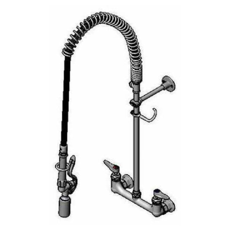 The T&S Brass B-0133-CR-BC-T EasyInstall Pre-Rinse Unit is a high-performance solution designed specifically for professional kitchens requiring efficient pre-rinsing operations. This unit is characterized by its 8-inch wall mount design, featuring quarter-turn cerama cartridges with integrated check valves for enhanced control and durability. It is equipped with lever handles for easy operation and includes an EasyInstall 18-inch riser to ensure a seamless setup process. The unit's 44-inch flexible stainless steel hose offers ample reach, while the 0.65 GPM low flow spray valve with swivel (B-0107-C) maximizes water efficiency without compromising performance. For additional stability, it includes a 6-inch wall bracket (B-0109-01). An accessory fitting tee and 1/2-inch NPT female inlets are part of the assembly, facilitating versatile connections. Notably, this pre-rinse unit is low lead and certified by NSF, aligning with stringent health and safety standards. Its advanced design and reliable components make it an invaluable tool for various segments within the foodservice industry, particularly those prioritizing sustainability and efficiency in their operations. Whether in a bustling restaurant kitchen or a high-capacity catering facility, the T&S Brass B-0133-CR-BC-T is engineered to meet the rigorous demands of professional culinary environments.
