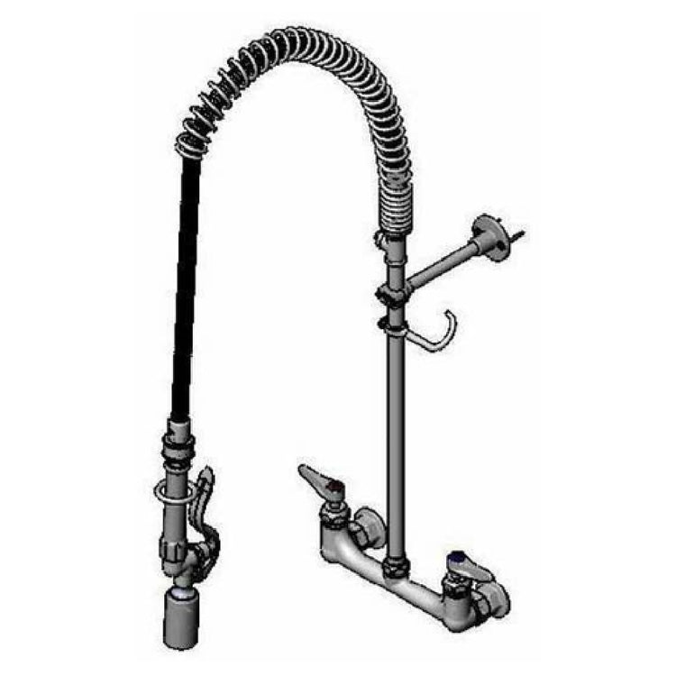 The T&S Brass B-0133-CR-BJ-SK EasyInstall Pre-Rinse Unit is a versatile and high-performance solution for commercial kitchens that require durable and efficient pre-rinse systems. This unit features an 8-inch wall mount design, complemented by quarter-turn cerama cartridges equipped with check valves to ensure reliable water flow control. Designed for ease of installation, it includes the EasyInstall 18-inch riser and a 6-inch wall bracket for secure mounting. The 44-inch flexible stainless steel hose provides extended reach and maneuverability, while the 1.07 GPM valve (B-0107-J) with swivel offers efficient water usage and adaptability in various washing tasks. The unit also includes 1/2-inch NPT male inlets, ensuring compatibility with standard plumbing fixtures. Additionally, this pre-rinse unit is designed to meet low lead requirements and is NSF certified, highlighting its compliance with safety and hygiene standards. Ideal for restaurants, hotels, and other food service establishments, the T&S Brass B-0133-CR-BJ-SK is engineered to deliver performance and reliability, making it an essential component in maintaining cleanliness and efficiency in demanding kitchen environments.