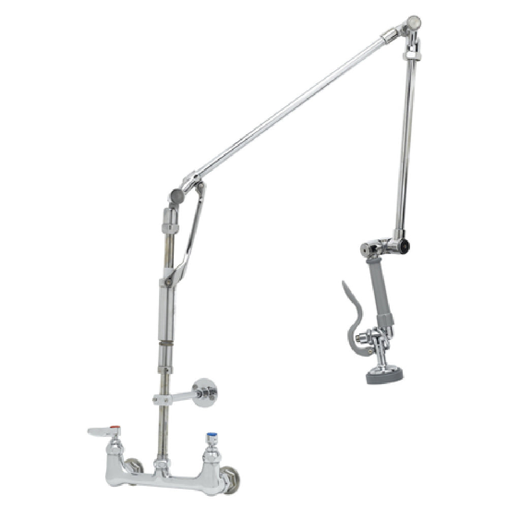 The T-S Brass B-0134-B EasyInstall Pre-Rinse Unit Wall Mount Mixing Faucet with 8" Adjustable Centers is a robust solution designed for efficient kitchen environments. Featuring quarter-turn Eterna cartridges with spring checks, it ensures smooth operation and durability. The unit is equipped with lever handles that have color-coded indexes for easy identification and use. Its retractable arm assembly stands at 33-1/2" high in the normal hanging position and extends to a 19-5/8" overhang at maximum pull-down, providing flexibility and reach. The downpipe includes a heat-resistant gray handle and a hold-down ring for safety and comfort. A 1.15 GPM spray valve (B-0107) is included, optimizing water flow for pre-rinsing tasks. The unit comes with a 6" adjustable wall bracket for secure installation. Crafted from polished chrome-plated brass, the faucet body ensures longevity and a sleek appearance. The 1/2" NPT male inlets facilitate easy connectivity to plumbing systems. Certified by CSA, this pre-rinse unit is tailored for commercial kitchens, restaurants, and other foodservice operations seeking reliable, high-performance fixtures that combine functionality with ease of installation and maintenance.
