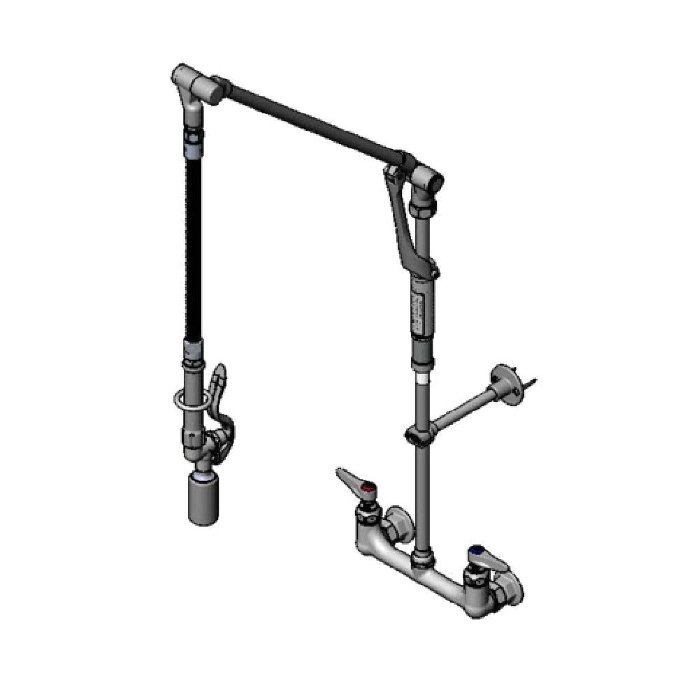 The T&S Brass B-0137 EasyInstall Pre-Rinse Unit - wall mount mixing faucet with 8" adjustable centers - is a premium plumbing fixture designed for diverse market segments within the food service industry. This unit features quarter turn Eterna cartridges with spring checks, ensuring reliable performance and longevity. The ergonomically designed lever handles are equipped with color-coded indexes for easy identification and use. Featuring a retractable swivel arm assembly, the unit measures 40" high in its normal hanging position and extends to a 20-15/16" overhang at maximum pull-down, offering flexibility for various washing tasks. A 20" flexible stainless steel hose, complete with a heat-resistant gray handle and hold-down ring, enhances durability and user comfort. The B-0137 is equipped with a 0.65 GPM low flow spray valve (B-0107-C), promoting water efficiency without compromising performance. For secure installation, a 6" adjustable wall bracket supports the polished chrome-plated brass faucet body, ensuring both aesthetic appeal and robustness. The unit's 1/2" NPT female inlets facilitate easy connection to existing plumbing systems. This pre-rinse unit stands as a versatile and efficient tool, meeting the rigorous demands of professional kitchens and ensuring compliance with industry standards.