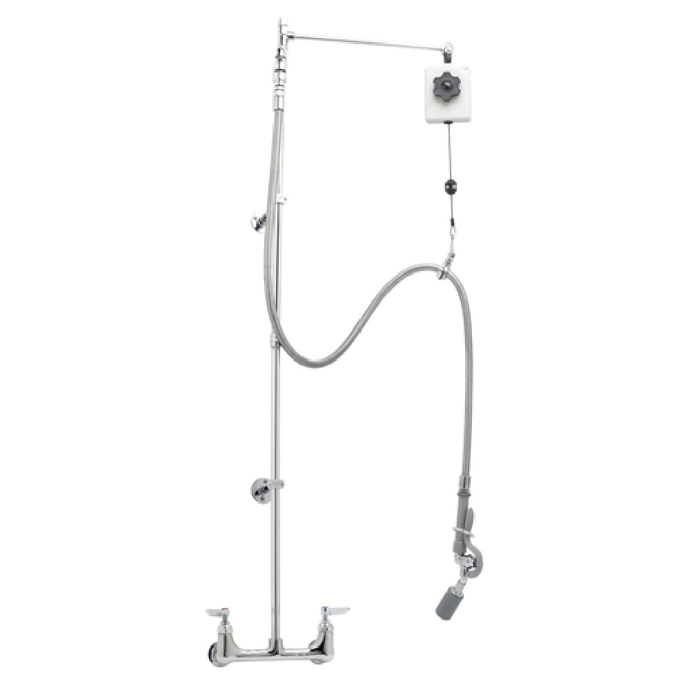 The T&S Brass B-0140-01 EasyInstall Pre-Rinse Unit Wall Mount Mixing Faucet with 8" Adjustable Centers is designed for optimal performance in commercial kitchens, providing exceptional utility with its technical features. This unit includes quarter-turn Cerama cartridges equipped with check valves, ensuring precise water control. The faucet's lever handles feature color-coded indexes for easy operation. It comes with both a 24" and an 18" riser, accommodating various installation requirements. The 14" overhead swivel extension arm with an adjustable tension balancer allows for flexible positioning, while the swivel flow assembly offers adaptability for different tasks. A 68" flexible stainless steel hose, complete with a heat-resistant gray handle and hold-down ring, ensures durability and ease of use. The unit is equipped with a 0.65 GPM low flow spray valve (B-0107-C35), optimizing water conservation without sacrificing performance. Two 6" adjustable wall brackets provide secure mounting, and the polished chrome stainless steel faucet body enhances its longevity and aesthetic appeal. With 1/2" NPT female inlets and CSA certification, the T&S Brass B-0140-01 is a reliable and efficient choice for professional environments, combining advanced features with robust construction to meet the demanding needs of the foodservice industry.