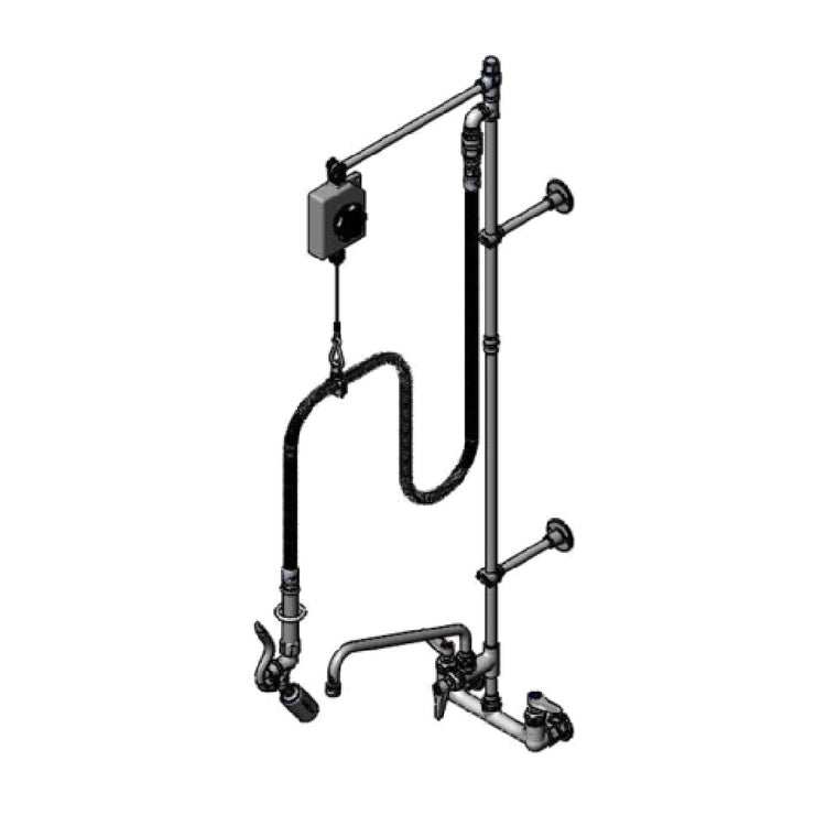 The T&S Brass B-0140 EasyInstall Pre-Rinse Unit is a wall-mounted mixing faucet designed for efficiency and versatility in commercial kitchen environments. Featuring 8-inch adjustable centers, it includes an EasyInstall add-on faucet and is equipped with a 12-inch swing nozzle complete with a stream regulator outlet (062X). This unit utilizes quarter-turn Cerama cartridges with built-in check valves and lever handles that are color-coded for ease of use. The package includes both a 24-inch and an 18-inch riser, as well as a 14-inch overhead swivel extension arm with an adjustable tension balancer and a swivel flow assembly. Additionally, the unit comes with a 68-inch flexible stainless steel hose designed with a heat-resistant gray handle and hold-down ring. It incorporates a 0.65 GPM low flow spray valve (B-0107-C35) for efficient water usage and includes two 6-inch adjustable wall brackets for secure installation. The polished chrome stainless steel faucet body is both durable and visually appealing, while the 1/2-inch NPT female inlets ensure compatibility with standard plumbing systems. Certified by CSA, this pre-rinse unit is an ideal choice for various commercial applications, offering reliability and performance in demanding kitchen settings.