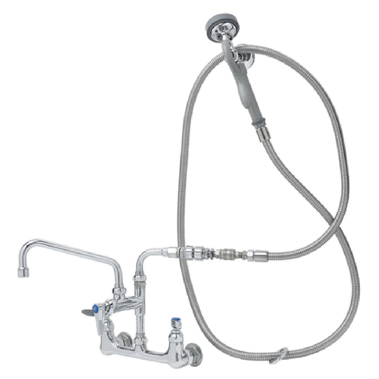 The T&S Brass B-0175-01 Spray Assembly Wall Mount Mixing Faucet with 8" Adjustable Centers is a meticulously engineered solution designed to meet the diverse needs of various industries such as hospitality, healthcare, and food service. This EasyInstall add-on faucet features an 8" swing nozzle with a stream regulator outlet (060X), ensuring precise water flow control. It is equipped with quarter-turn Eterna cartridges with spring checks for reliable performance and includes color-coded lever handles for intuitive operation. The assembly is built with a 3/8" NPT vacuum breaker (B-0970-FE) and a quick disconnect coupling (B-0452), providing enhanced safety and convenience. The 90° swivel adapter arm offers flexible positioning, while the 96" flexible stainless steel hose with a heat-resistant gray handle and hold-down ring supports high-temperature applications. Additionally, the 1.15 GPM angled spray valve (B-0107-035) is perfect for efficient cleaning tasks. The faucet body is constructed from polished chrome-plated brass, ensuring durability and a sleek appearance. Designed with 1/2" NPT female inlets, this assembly is CSA compliant, guaranteeing adherence to safety standards. The T&S Brass B-0175-01 is an indispensable choice for environments demanding reliability, flexibility, and compliance.