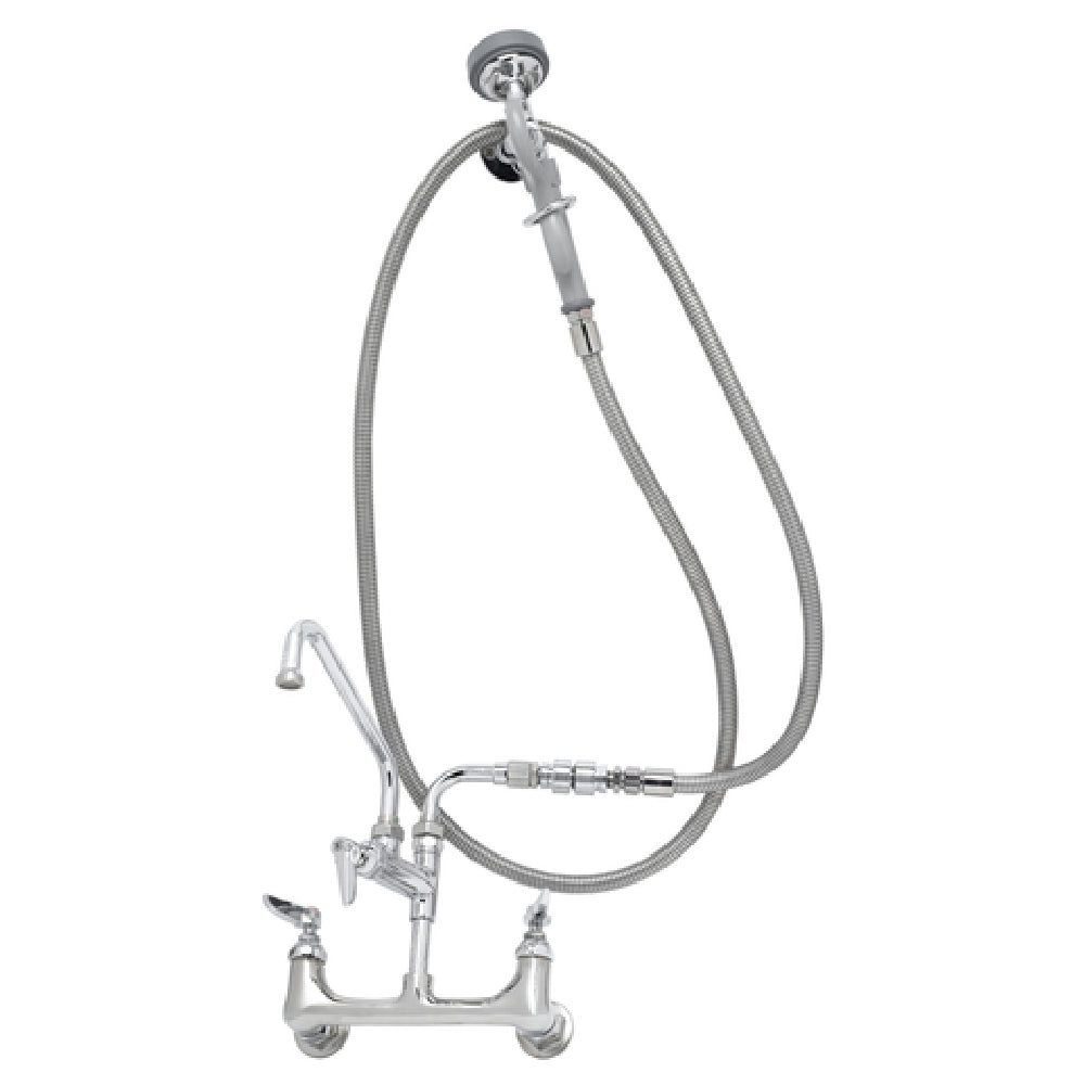 The T&S Brass B-0175-03 Spray Assembly Wall Mount Mixing Faucet with 8" Adjustable Centers is a highly versatile and efficient fixture for commercial kitchens and food service establishments. Its EasyInstall add-on faucet is complemented by a 12" swing nozzle featuring a stream regulator outlet (062X), allowing for precise water flow control. The faucet incorporates quarter-turn Eterna cartridges with spring checks and lever handles with color-coded indexes for ease of use and maintenance. Additionally, it is equipped with a 3/8" NPT vacuum breaker (B-0970-FE) to prevent backflow, ensuring safe and reliable operation. The unit includes a 90° swivel adapter arm and a 104" flexible stainless steel hose with a heat-resistant gray handle and hold-down ring, providing ample reach and durability. An angled 1.15 GPM spray valve (B-0107-035) and a convenient wall hook enhance its functionality. Constructed from polished chrome-plated brass, the faucet body offers both aesthetic appeal and robust performance, featuring 1/2" NPT female inlets for straightforward installation. Certified by CSA, the T&S Brass B-0175-03 is an ideal choice for professionals seeking a reliable and adaptable water delivery solution in demanding environments.