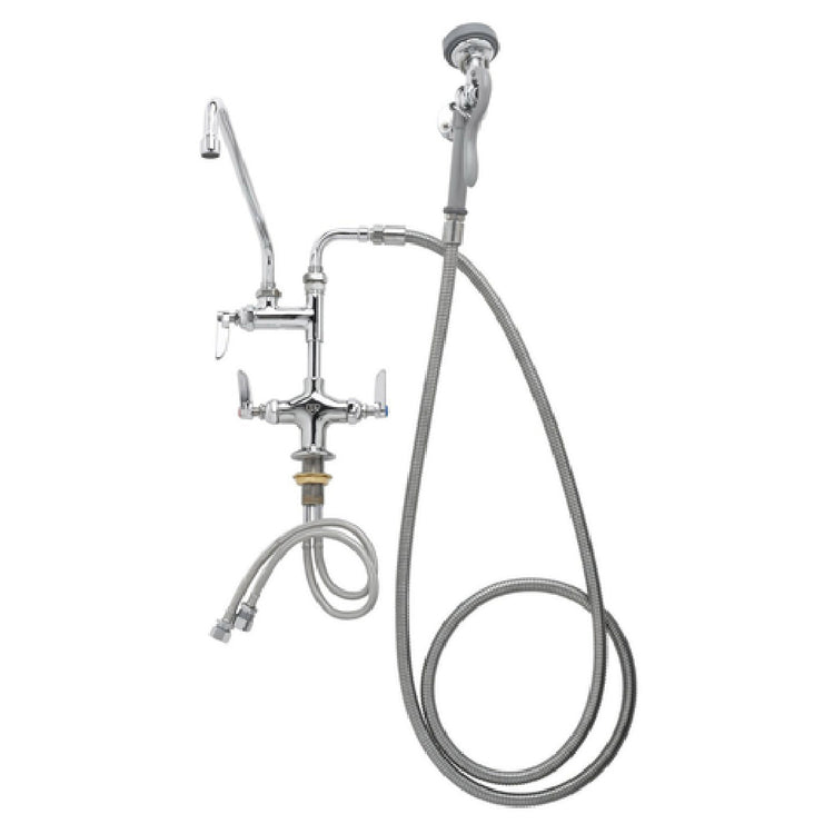 The T-S Brass B-0179 Pre-Rinse Unit Single Hole Base Deck Mount is a highly engineered solution tailored for professional kitchens requiring efficient and durable pre-rinse capabilities. It features a single hole base design for easy installation and a deck mount configuration that is space-efficient. The unit includes an add-on faucet with an 18-inch double joint swing nozzle, offering flexibility and reach for various sink sizes. The 104-inch stainless steel hose ensures longevity and resilience against wear and tear, while the swivel adapter arm enhances maneuverability. This pre-rinse unit is equipped with a vacuum breaker to maintain water safety standards and a wall hook for convenient hose storage. The quarter-turn Eterna cartridges provide ease of use and reliability, minimizing maintenance needs. Additionally, the unit is designed with low lead content, making it a suitable choice for establishments adhering to stringent safety and health regulations. This combination of features makes the T-S Brass B-0179 an ideal choice for restaurants, hotels, and catering services looking for a robust, compliant, and flexible pre-rinse solution.
