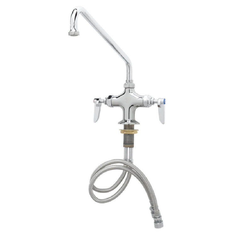 The T&S Brass B-0201-M Mixing Faucet is a meticulously engineered single hole deck mount fixture, designed with precision for versatile applications across various segment markets in the plumbing industry. Featuring a 12-inch swing nozzle with a stream regulator outlet, this faucet allows for controlled water flow and adaptability in diverse environments. Equipped with robust Eterna cartridges, it ensures long-lasting performance and reliability, while the lever handles are complemented by color-coded indexes for intuitive use. The faucet is supported by 18-inch flexible stainless steel supply hoses, which include 1/2-inch NPSM male inlets for straightforward installation. Furthermore, this model meets ADA compliance standards, highlighting its commitment to accessibility and inclusivity. Packaged in sets of six per master pack, the T&S Brass B-0201-M Mixing Faucet is an exemplary choice for those seeking durability, efficiency, and user-friendly functionality in both commercial and residential settings. Its thoughtful design and high-quality construction make it a distinguished option for professionals and homeowners alike, ensuring a seamless integration into any plumbing system.