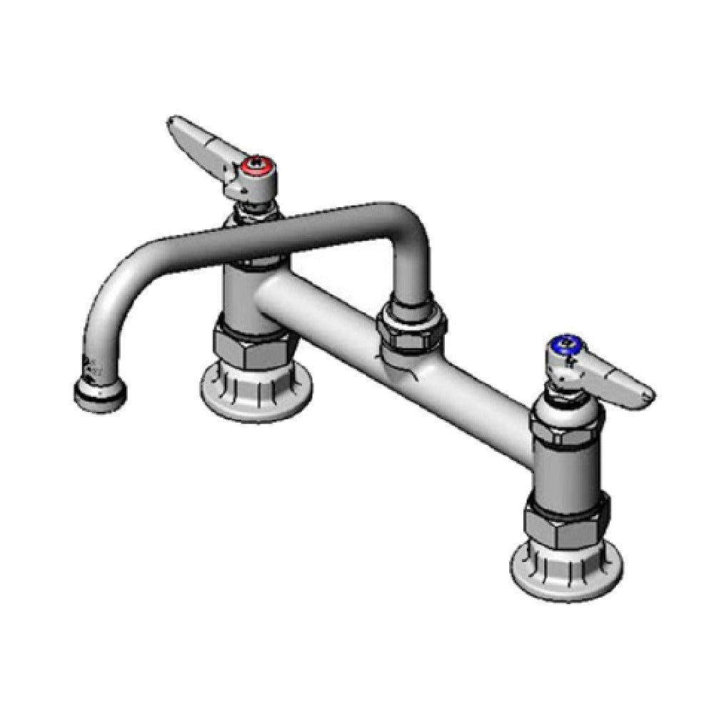The T&S Brass B-0220-060X Pantry Mixing Faucet is a precisely engineered double deck mount faucet, designed for optimal functionality and efficiency in commercial kitchens and other professional settings. Featuring 8-inch centers and an 8-inch swing nozzle, this faucet allows for versatile water direction and coverage, catering to a variety of culinary and cleaning needs. Its robust lever handles are intuitive and comfortable to use, ensuring smooth operation. The stream regulator outlet is a key feature, providing efficient water flow control, while the quarter-turn Eterna cartridges with spring checks enhance durability and prevent backflow, ensuring long-lasting performance. This innovative faucet is equipped with a 1/2-inch NPT connection, facilitating straightforward installation. Additionally, the T&S Brass B-0220-060X is a low lead compliant product, aligning with environmental and safety standards. It is also ADA compliant, making it an accessible option for all users. This mixing faucet is an excellent choice for businesses seeking reliability and compliance with health and safety regulations, making it suitable for a diverse range of industry sectors that require robust and reliable water management solutions.