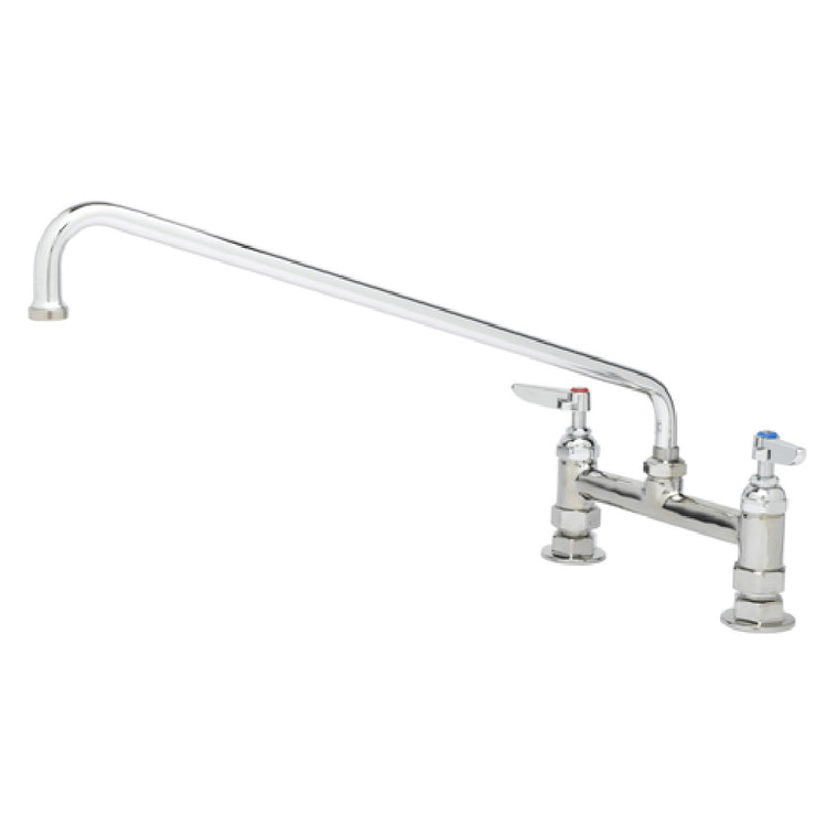 The T&S Brass B-0220 Mixing Faucet Deck Mount 18" Swing Nozzle is a meticulously engineered plumbing component optimal for facilities requiring robust water flow management. This faucet features a deck-mounted design with 8" centers, facilitating secure installation and compatibility with diverse sink configurations. It incorporates an 18" swing nozzle, providing flexible water distribution for various operational needs. The inclusion of 1/2" IPS eccentric flanged female inlets ensures efficient connectivity within existing plumbing frameworks. The faucet is equipped with quarter-turn Eterna cartridges and spring checks, enhancing its durability and performance by enabling smooth operation and reducing wear. These features cater to commercial kitchens and industrial environments where reliability is paramount. Lever handles offer intuitive control, ensuring ease of use across different user demographics. The faucet's low lead construction aligns with modern safety standards, making it suitable for environments prioritizing health compliance. Additionally, its ADA Compliance underscores its accessibility for all users, emphasizing inclusivity in design. This mixing faucet stands out in the industry with its blend of precision engineering, adaptability, and adherence to safety regulations, making it an asset in any high-demand plumbing setup.