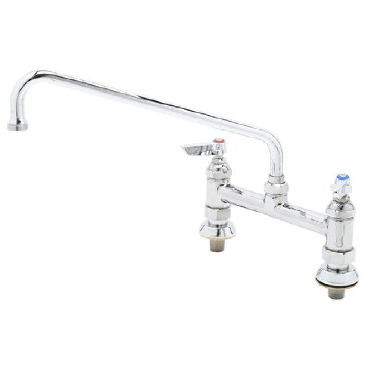 The T&S Brass B-0221-EE Mixing Faucet - deck mount, 12" swing nozzle is an exceptional fixture designed for a range of professional settings, particularly in food service and hospitality industries. This faucet features 8" centers on the deck, providing stability and ease of installation. Its 1/2" IPS EE male inlets with adjustable flanges ensure compatibility with varied plumbing setups. Additionally, the faucet is equipped with advanced quarter-turn Eterna cartridges with spring checks, offering reliable operation and longevity. The inclusion of lever handles enhances user accessibility, while the low lead content aligns with strict safety standards. As an ADA Compliant product, it meets necessary accessibility guidelines, making it suitable for establishments needing to accommodate diverse user needs. This faucet is engineered to deliver consistent performance, addressing the demands of high-usage environments. Its robust construction and thoughtful design make it a valuable choice for professionals seeking quality and efficiency in their workspace plumbing solutions.